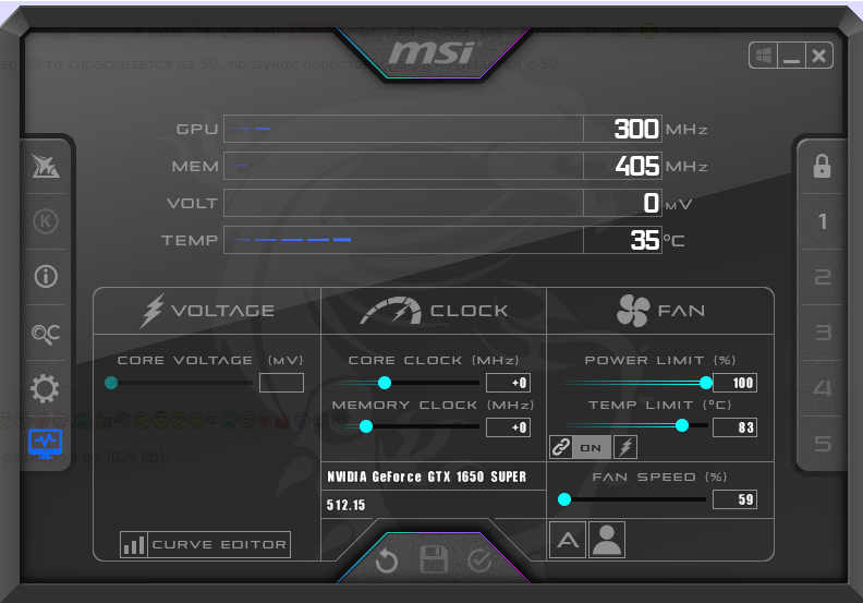 не уменьшаются в ручную обороты вентилятора в msi afterburner ниже 59% если вручную ввести например 30 то сбрасывается на 59, ползунок оборотов кулера начинается с 59%, gtx 1650 super последние драйвера, windows 10