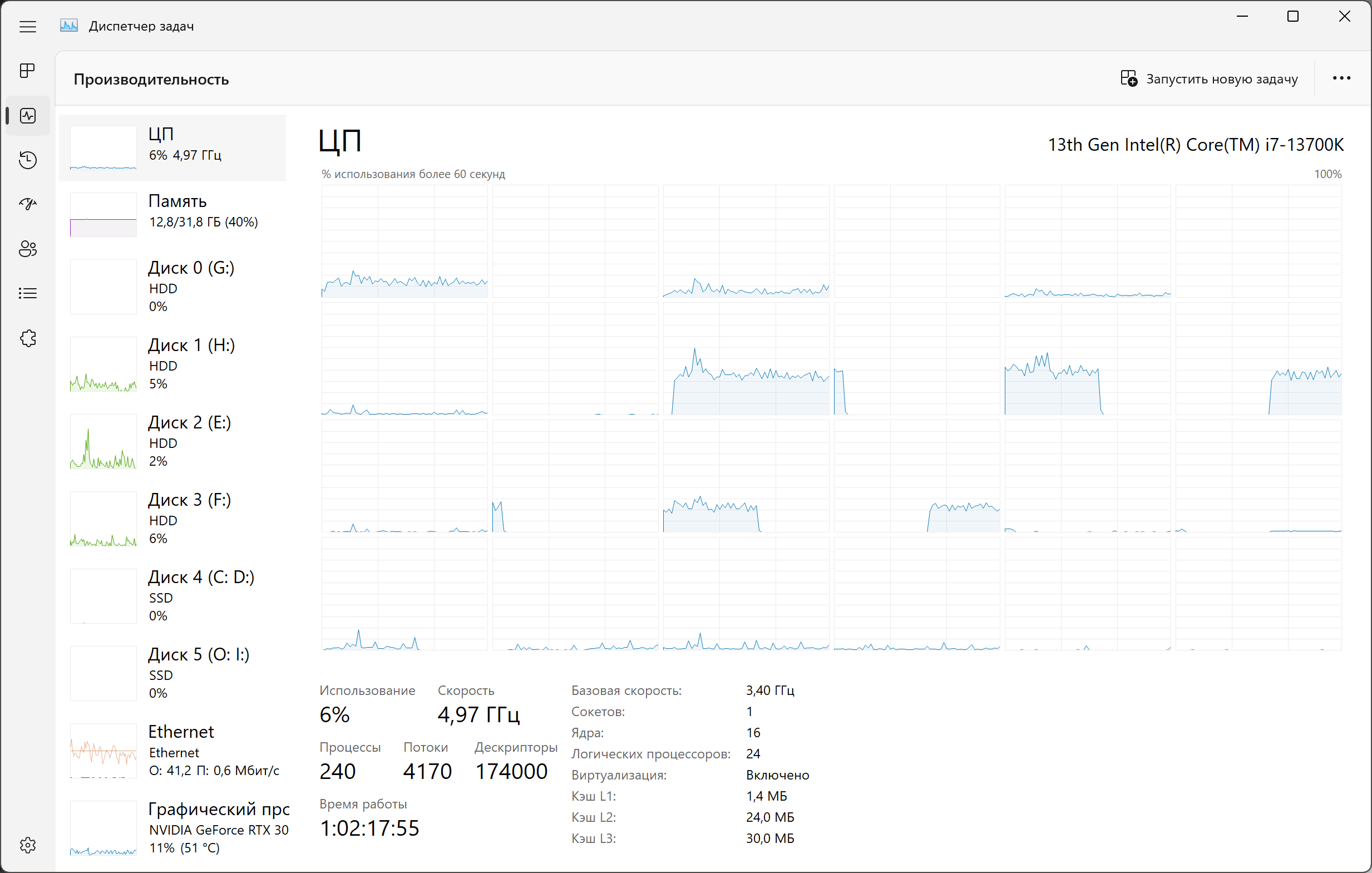 Вот пример, Process Explorer показывает адекватную загрузку в районе 0%, какие-то всплески есть на одном ядре. Это у меня режим покоя, ну торренты раздаются, запущено пару идл-игр в фоне, но это нагрузка 3-5% у старого 9700к и вин11 была версии 21H2. Обновил железо, последнюю версию винды с сайта микрософта - результат на скрине. Я не знаю, что он там за адскую нагрузку на ядрах рисует