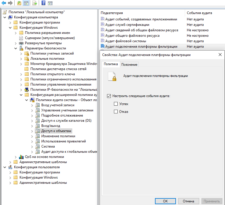 Кстати господа я нашёл способ отключать события аудита. Весьма корректный и простой. Суть в том, что по-умолчанию настройки аудита не указаны, что вводит в заблуждение и я например полагал, что это означает выключены. А на самом деле это означает, что они могут быть как выключены, так и включены. gpedit.msc Пример корректно отключённого аудита.