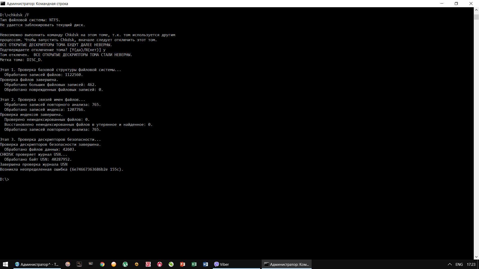 Команды fsutil usn deletejournal /d D: chkdsk D: /f /offlinescanandfix