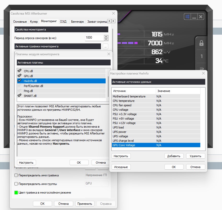 Для вывод в мониторинг напряжения GPU не нужно использоваться сторонний софт. Используйте внутренние датчики MSI или RTSS в зависимости от варианта вывода (старого или нового).