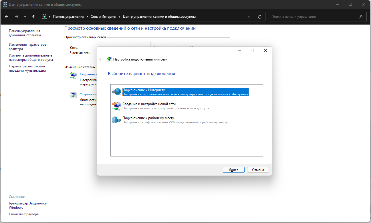Панель управления\Сеть и Интернет\Центр управления сетями и общим доступом\Создание и настройка нового подключения или сети