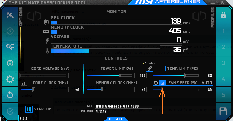 Ну так надо же не мой график делать, а свой собственный мой тут для примера, а у меня GTX1080. В любом случае, пользовательский график контроля способен успокоить вентиль и не вырубить его насовсем. И не факт, что у тебя сработал этот график: там немного не понятны кнопки авто/ручной, надо проконтролировать сначала изменяется ли скорость кулера при нужной температуре.
