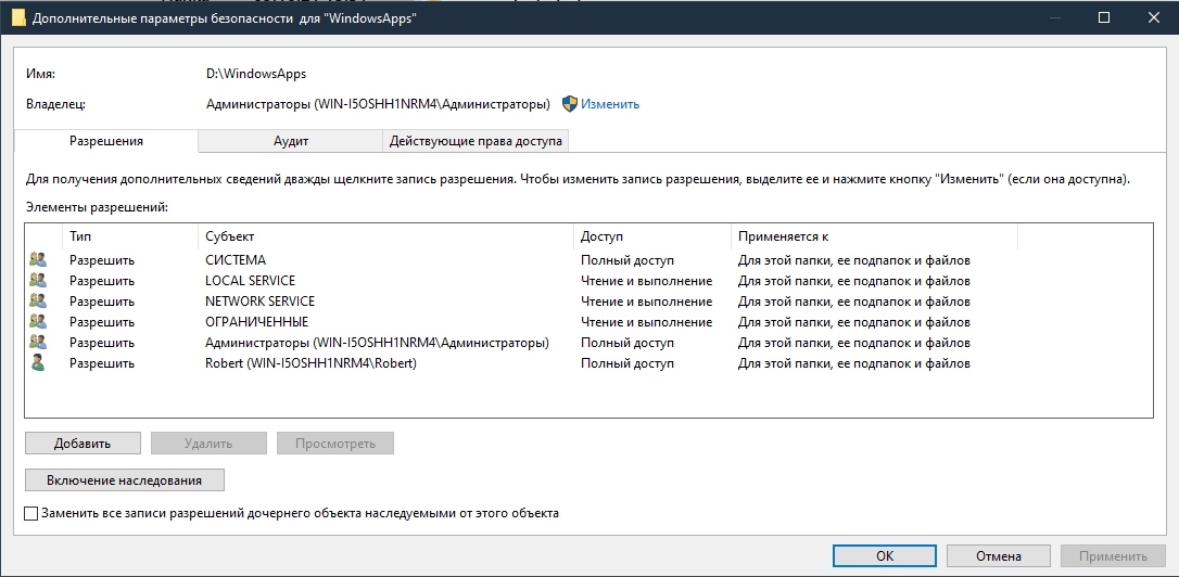 Всем привет, помогите разобраться с проблемой. Есть система на Win10 с последними обновами (вроде). Системный диск переполнился и новые проги стал ставить на отдельный винт в новую папку D/WindowsApp. До недавнего времени все было в порядке. На днях неуполномоченное лицо поковырялось в компе, были внесены какие-то хаотические изменения в настройки через панель управления (без глубинных твиков в реестре и тп) и что-то сломалось. Теперь при запуске любой программы из этой папки выходит сообщение (рис.1). Поверхностный поиск в гугле вывел на видео, где советовали изменить права собственности на эту коренную папку, и сейчас они выглядят так (рис.2). Не помогло. Вход в систему происходит через одного пользователя с админскими правами (рис.3). Собственно, подскажите, как все вернуть. Обратные изменения в панели управления не делал, т.к. неизвестно точно что там изменили и как было раньше. Спасибо