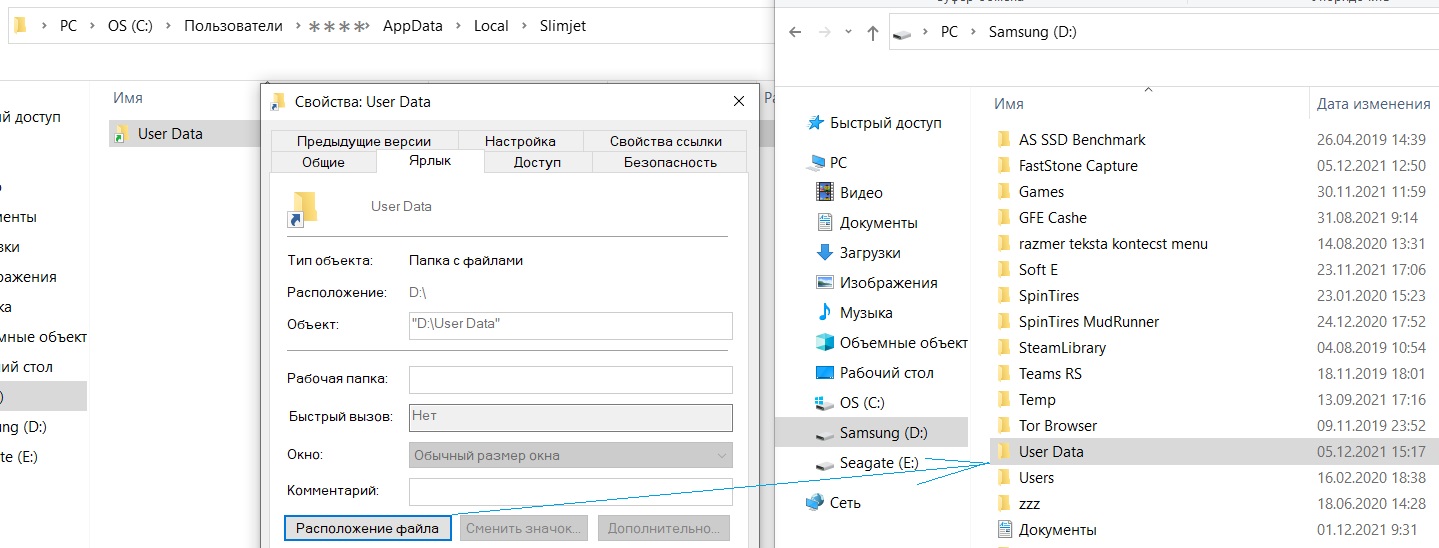 не правильный сим-линк с кавычками. повторюсь, кавычки только для папок/файлов имя у которых из двух и более слов. хотя.. команды разные, может быть так и должно быть в вашем случае. у меня профиль браузера перенес : cd C:\Users\Имя\AppData\Local\Slimjet\ MKLINK /D "User Data" "D:\User Data"
