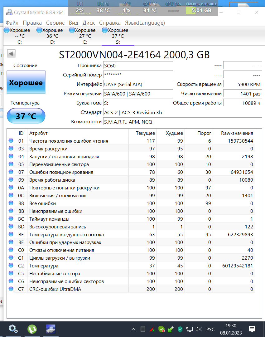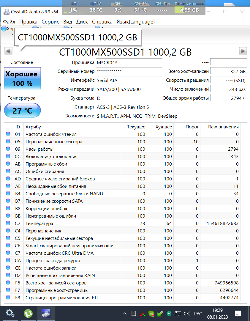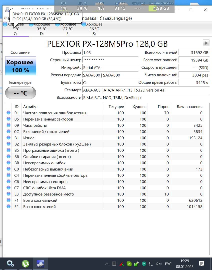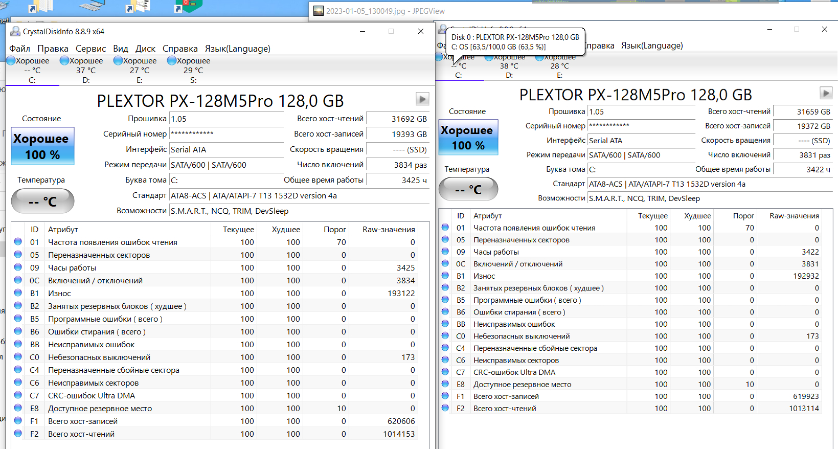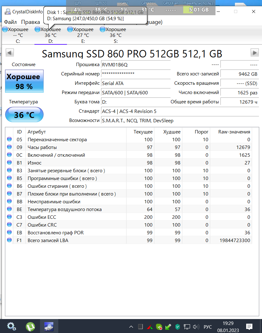 при том что на этом SSD побывала Win7 с кучей переустановок и бессчетным кол-вм восстановлений из образов ATI, затем Win 8 и 8.1, с октября 2019 установлена 10Prox64.