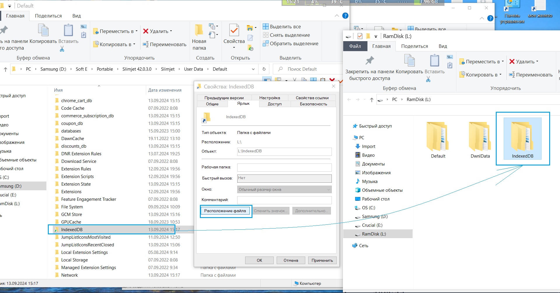 не нужно так делать, как я ранее сказал это сессии, при очистке папки IndexedDB слетают закладки на странице быстрого доступа. в RAM-диске очистка при каждой перезагрузке. назначать перенос данных на физический диск при завершении работы, и обратно в ram-диск при запуске, не та папка чтобы так заморачиваться..