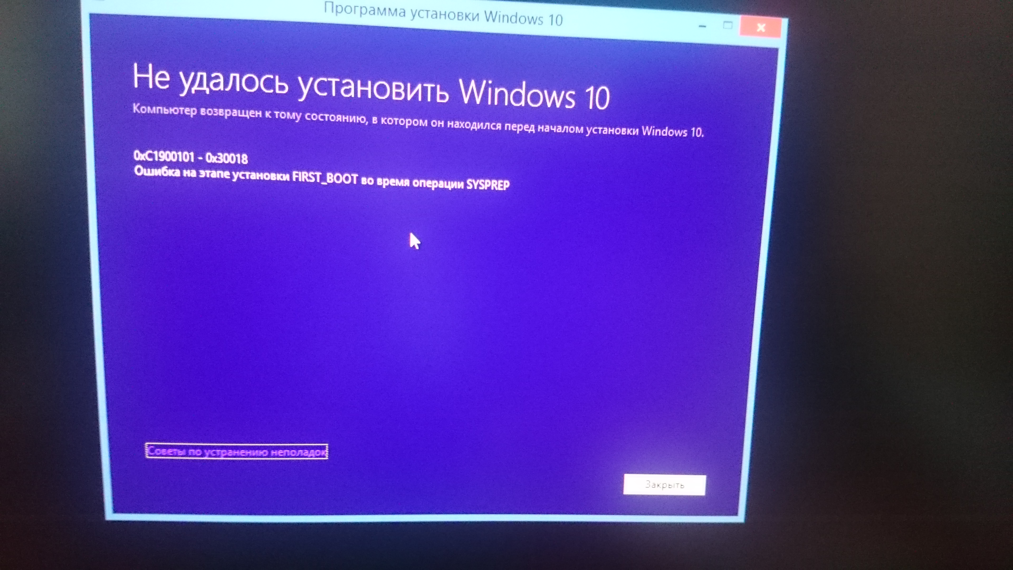 Ребят, помогите, у меня лицензия 8.1, уже второй раз пытабсь обновится до 10. Проблема собственно в чем, когда появляется чёрный экран с кружочком, а внутри процент установки, очень медленно все ползет, примерно 3-5% в час. На 33% вылезла ошибка 0хС190 0хС1900101-0х30018 Ошибка на этапе установки FIRST_BOOT во время операции SYSPREP. Снёс систему, поставил опять, 8.1, ввёл ключ лицензии, начал обновляться и снова беда.. В чем может быть проблема?((