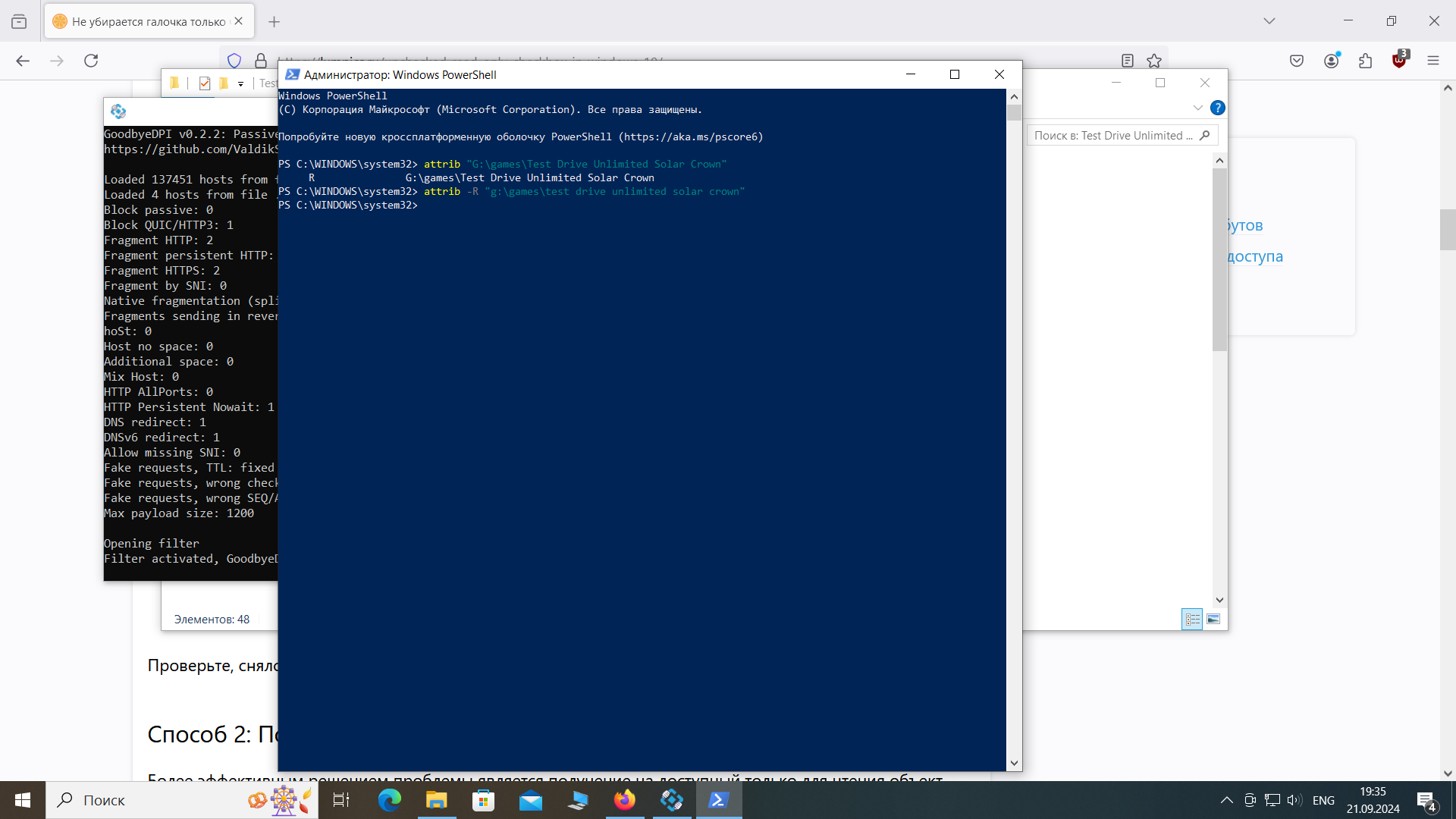 Читай внимательно свой первый скрин. Атрибут "только чтение" с папки ты снял, а вот с того, что в этой папке - нет. Для этого другие нужны др. параметры комманды attrib. Вроде /D, но это не точно. Гугли. И обнови gDPI. Со старыми версиями ютьюбик работает плохо.