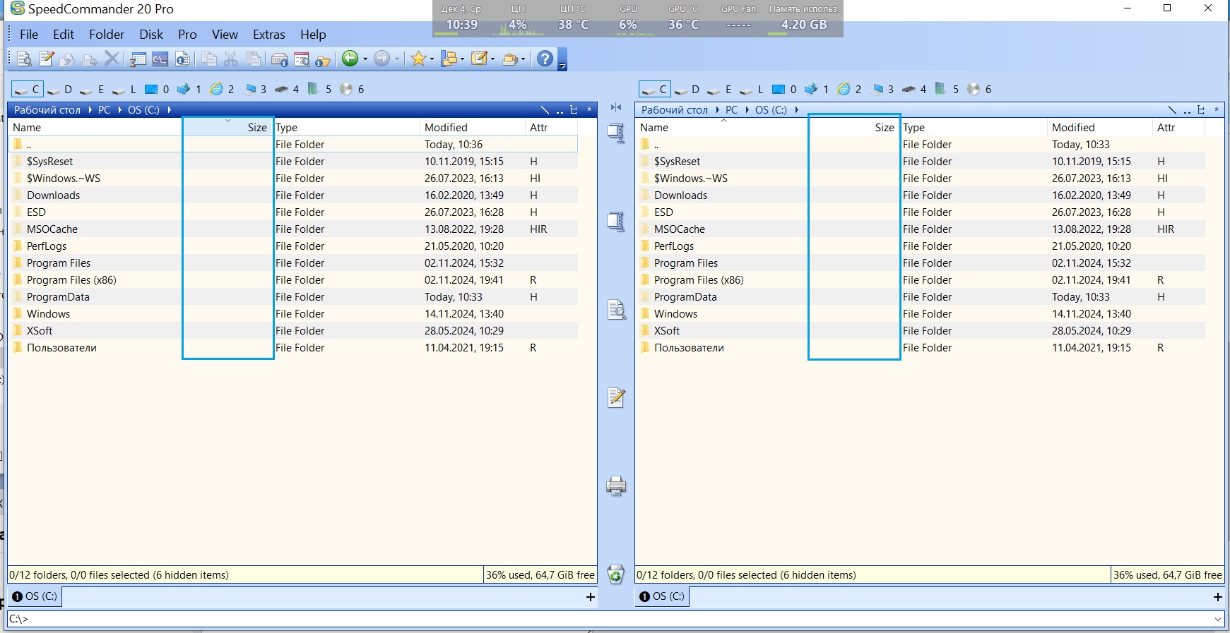 у меня почему то размер папок не показывает ни в Total Commander
