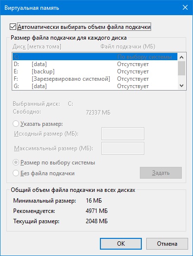 и тебе правильно сказали, подкачку не отключай. можешь минимальный размер зафиксировать на несколько гигов, в зависимости от потребности твоего ПО. а можно на "авто" оставить.