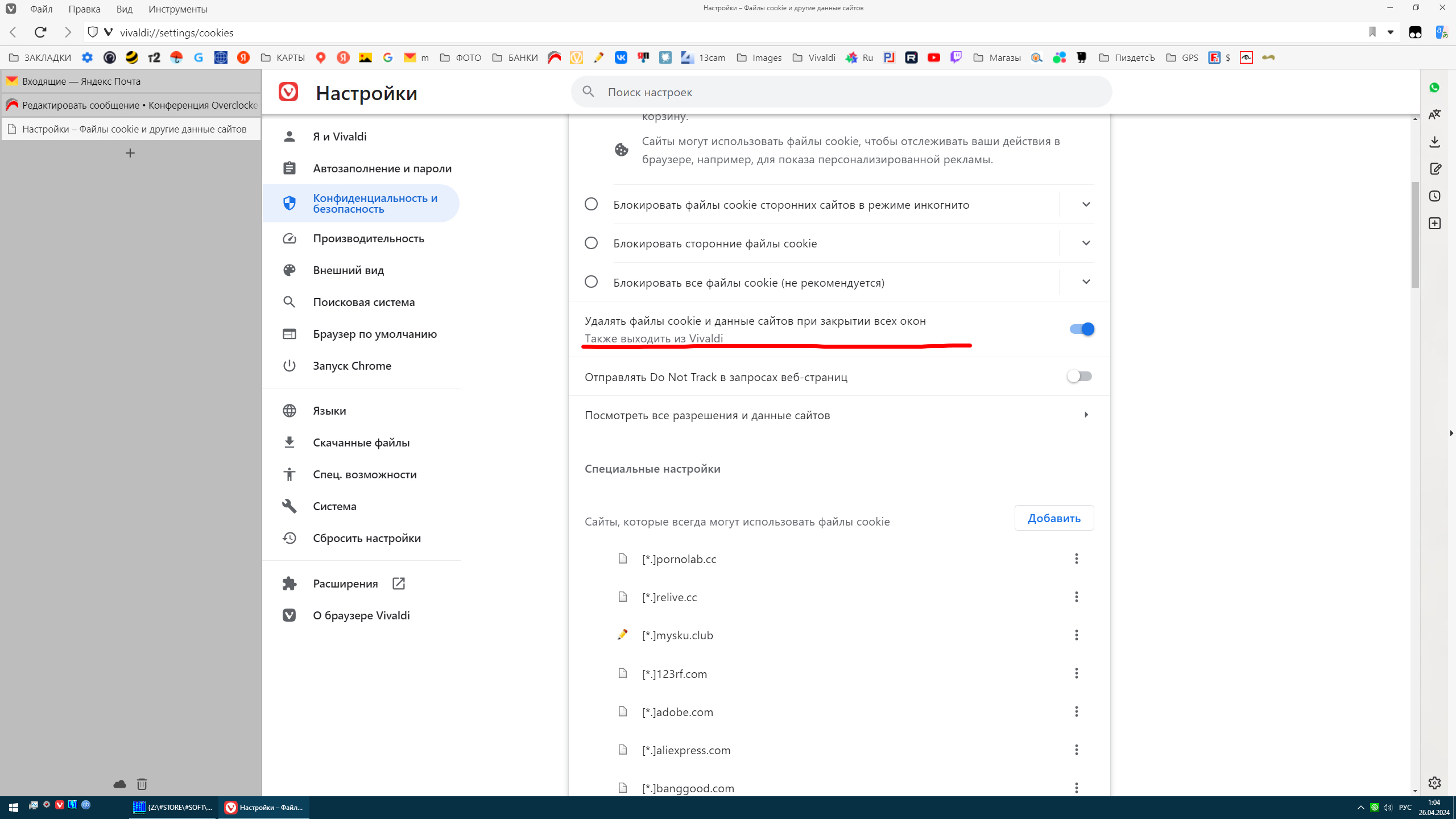т.е. я хочу чтобы куки всех сайтов при закрытии Вивальди удалялись, кроме тех сайтов которые в списке исключения.