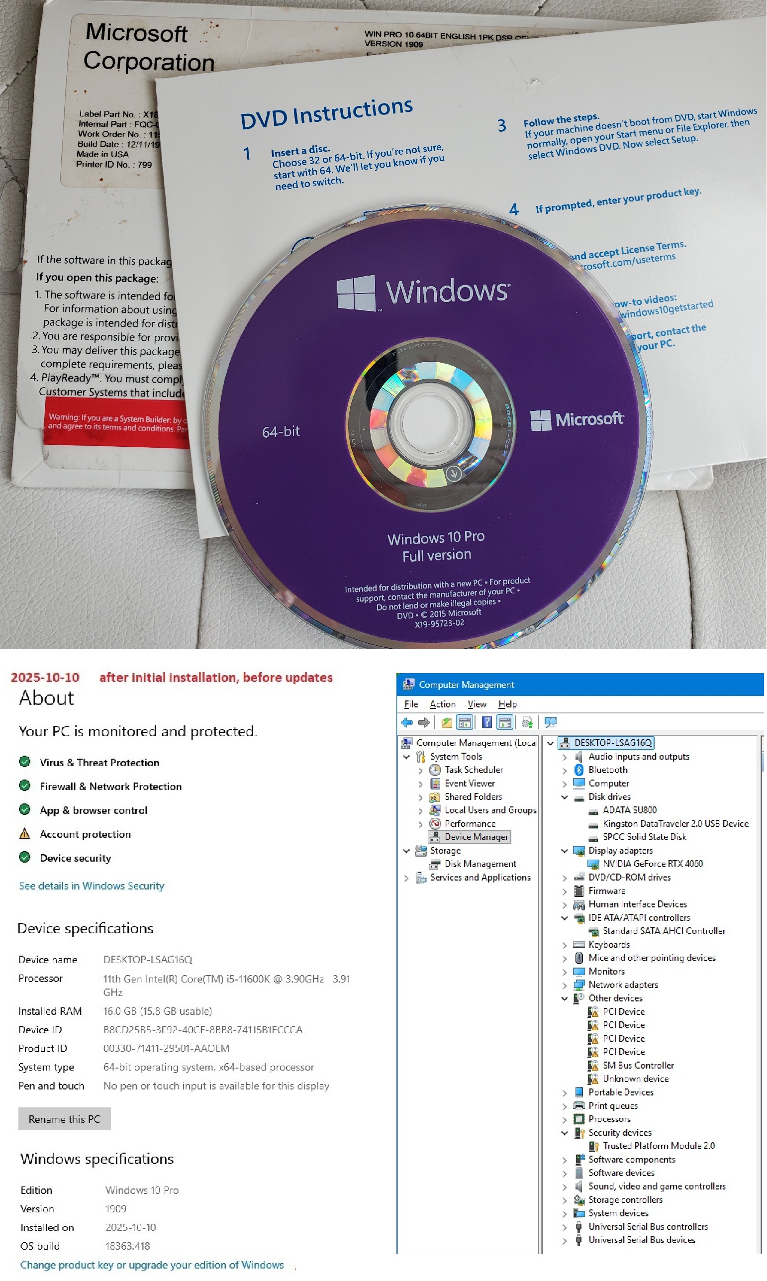 Да, можно ждать ничего не делая. Время то мчится быстро. - Мной был куплен 'Win10 Pro ver. 1909 ОЕМ DVD' в 2019 вместе с новым железом, но пролежал на полке до вчерашнего дня. Т.к. тогда ПК использовался для учёбы, и из-за невозможности быстрой переустановки всего софтвера получаемого в школе, - был перекинут диск со старого ПК на новый ПК. Итак, вчера - Здравствуй Win10 и прощай! -