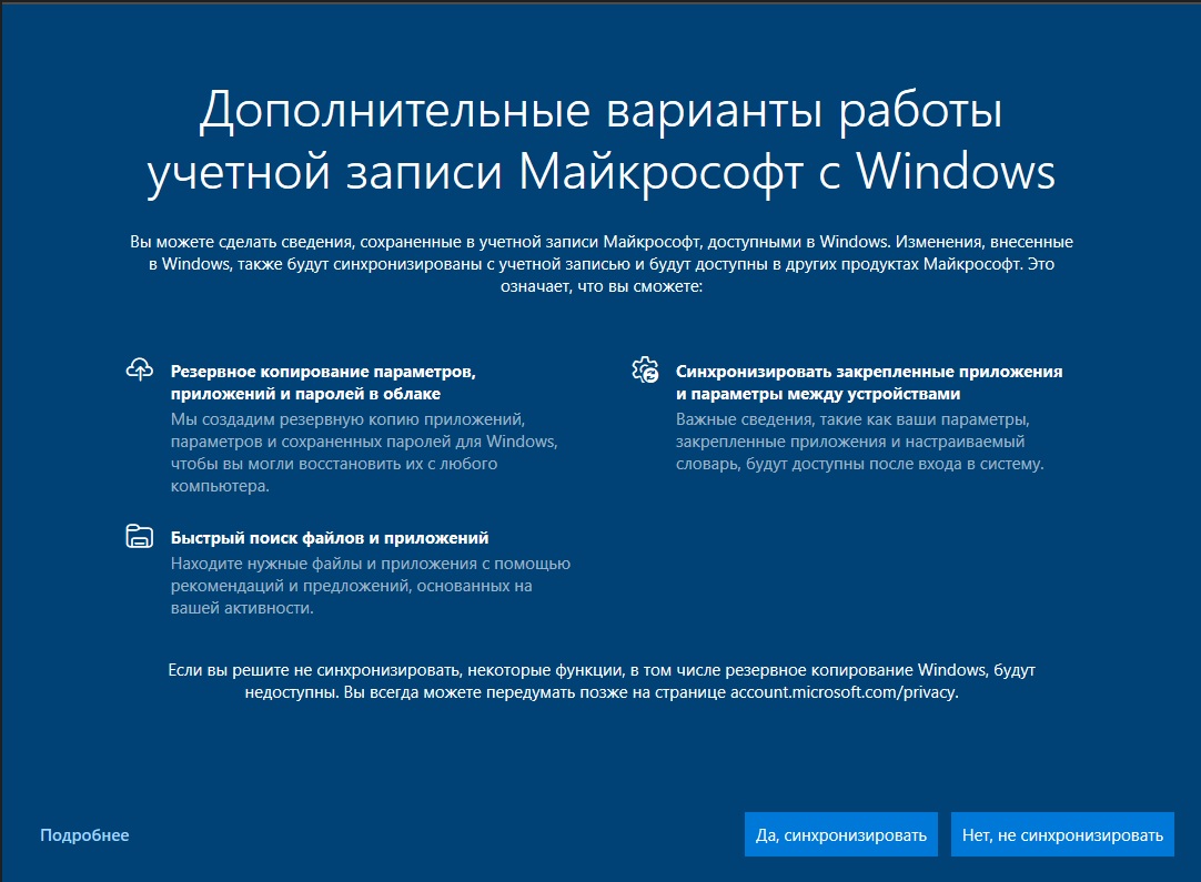 Как бы там ни было - чего вы боитесь учётной записи Майкрософт? Одним шпионом в системе будет больше. Есть же возможность выйти из неё и перейти на локальную учётную запись - пользуйтесь. Удобно же иметь учётку Майкрософт для синхронизации своих закладок в Эдже, прочий полезный инструментарий. Нет же - панический страх. Ну тогда бойтесь до конца - удаляйте учётные записи на своих Андроидах и Эплах! Будьте честны перед собой и окружающими! Не нужно быть "немножко беременными"!