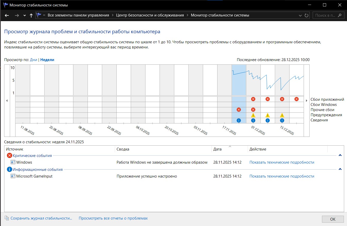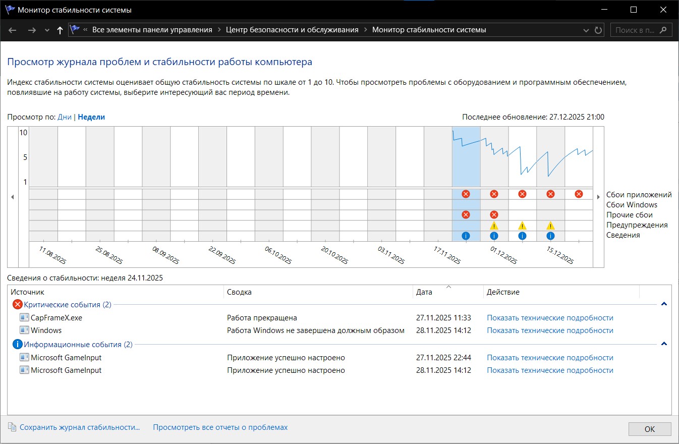 притом что гуи данной утилиты расчитан на отображение 20 недель (4,6 месяца) а в журнале событий (Event Viewer) есть стата за полгода. У всех так по дефолту ? Другими словами я хочу видеть всю стату по неделям в perfmon /rel, а раз он основывается на Event Logs в котором эта стата есть, то где то есть настройка на отображение, я так думаю. Но и если у всех perfmon /rel охватывает период только в 30 дней по дефолту, логично думать что винда считает это срок достаточным для оценки своей стабильности. Пойду узнаю у 11-ков.