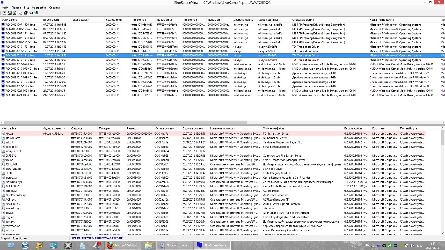 Добавлено спустя 26 минут 18 секунд: C:\Windows\LiveKernelReports\WATCHDOG\WD-20130724-0034.dmp кстати эти дампы же стираются при очищении журнала ? а то я колодовал с разгоном видяхи (экспериментировал) там были вылеты соответственно, но после этого я журнал стирал.