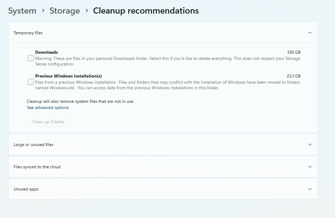 Можно глянуть в Settings -> System -> Storage -> Cleanup recommendations (хз, как по-русски будет)