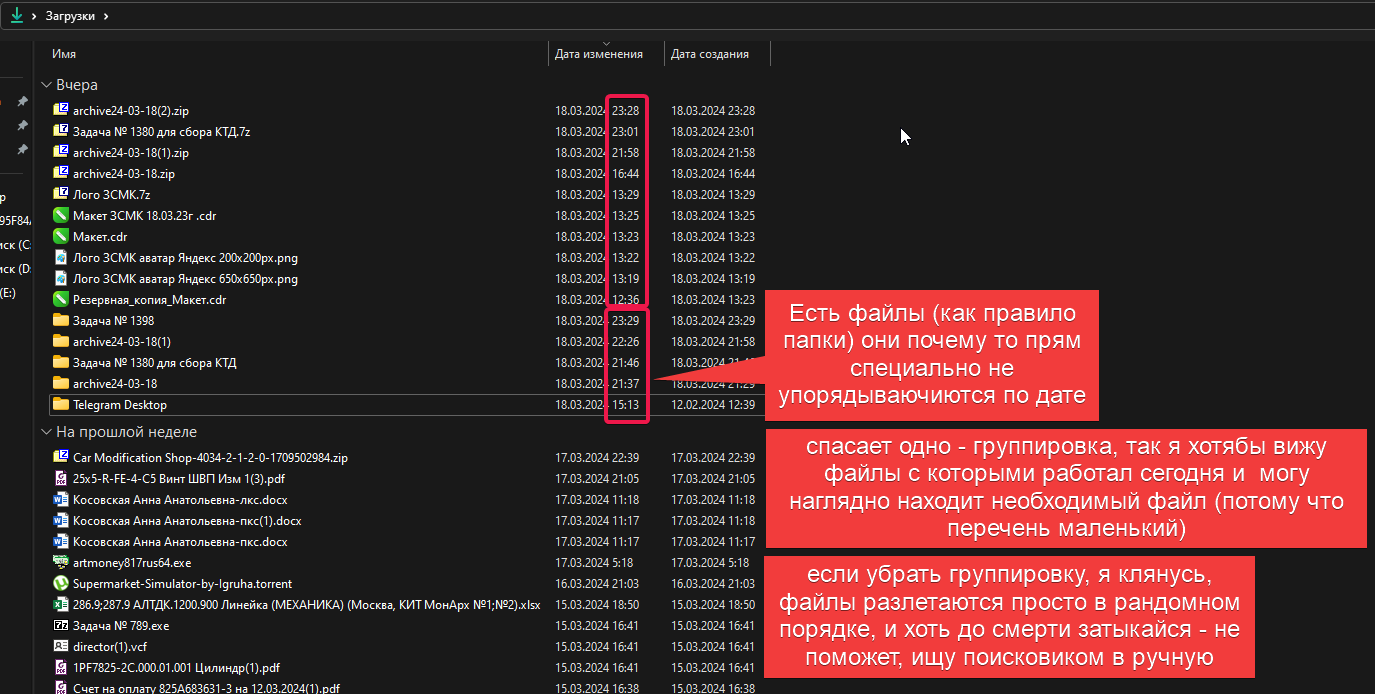 Господа у меня проблема, с проводником, он нормально не сортирует файлы. Мне как и большинству нужно чтобы при открытии папки я видел файлы в следующем порядке: Сверху новые Снизу старые Но мой чертов проводник поджигает мне задницу уже несколько месяцев это просто мучении, на 10ке было всё типи-топ, и вот я наконец то решился обратится за помощью, заранее спасибо. Проблема в следующем: большенство файлов сортируется верно, но рандомные файлы (в основном это созданные мной папки в этой дирректории) они улетают вообще не понятно в какую часть списка, боженька рандома наверное решил отыграться на мне. при этом эти файлы вот прям могут быть максимально новые (по дате) и всё равно они не сверху списка а бох знает где, они не пропадают, они все лежат в этой папке, но они просто разлетаются по не описуемой логике в этом списке. и хоть что ты тыкай - нет они не упорядочиваются по дате. подитожу, почти все файлы сортируются без проблем по дате, но есть часть файлов (в основном папки) они не сортируются они разлетаются по всему списку в рандомном порядке, помогите пожалуйста