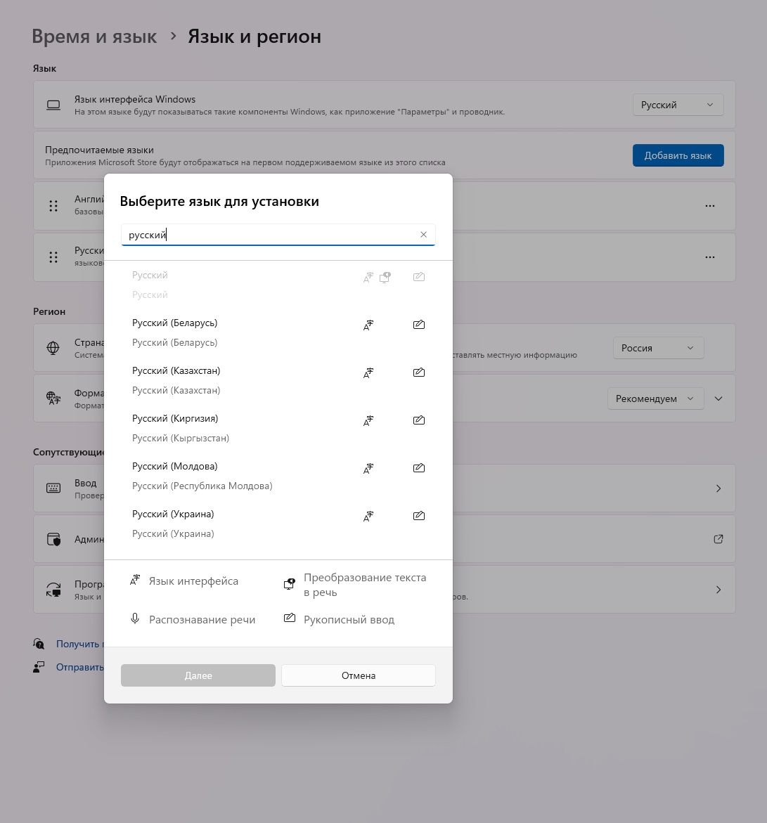 Параметры - Время и язык - Язык и регион - Предпочитаемые языки.