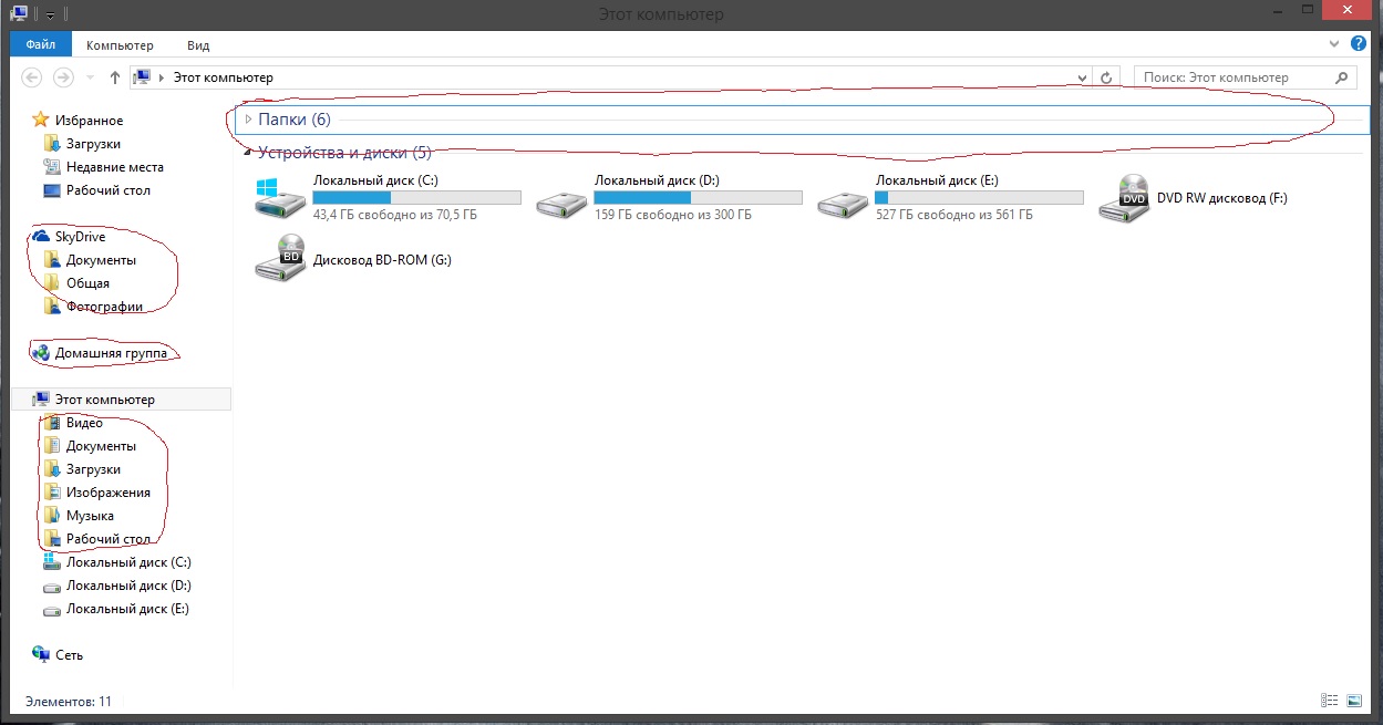 UltimateSurvival, Насчет лишних папок в "ЭТОТ компьютер" - писали выше. И давали ссылочку на reg-файлик. Я брал инфу здесь: http://windowstips.ru/notes/5466 Это уберёт и категорию "Папки" из большого окна Проводника. Со СкайДрайвом чуть сложнее, можно почитать здесь: http://gadgetick.com/newsnew-1465.html