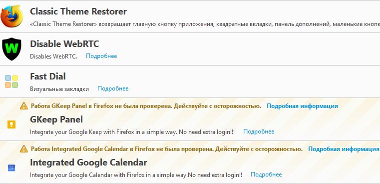 Для повышения удобства работы с браузером вы можете устанавливать расширения, а для изменения внешнего вида браузера - темы. Также расширения можно искать в окне установленных расширений браузера (about:addons).