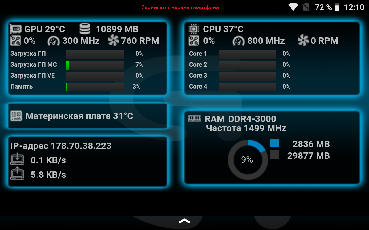 Не давал мне покоя куцый ARX-гаджет мониторинга системы для отображения информации на экранах смартфонов и планшетах. Сделал слегка усовершенствованный вариант апплета из шапки для AIDA64. К уже имеющемуся в шапке апплету добавлен (второй страницей) экран для вывода максимально подробной информации по системе на экран iPad. Скриншоты того, что получилось, и сам апплет для AIDA64, прилагаю. Естественно, апплет делал под свой конфиг железа. Но как болванка и для других конфигураций сгодится, после небольшой правки. Апплет запускается с экраном для смартфонов, чтобы переключать страницы, нужно назначить сочетание клавиш в настройках AIDA64.