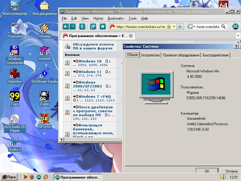 Пишу из под Windows Millennium Edition Все "Линолиум" ненавидят, а мне наоборот он очень нравится. Софт есть, браузеры, плееры и прочее. Стабилен, не падает на раз-два, как это делает 98ая. Да и работает шустро, разницы в скорости, по сравнению с 98ой, не вижу. Железо: Intel Desktop Board D815EEA Celeron Mendocino 433 128MB Ram PC-100 Abit Siluro T400 (GF2 MX400) Realtek RTL8139B WD800BB Даже в интернете сидеть можно, игры качать, форумы листать Про игры я вообще молчу, Quake 2 60 fps Скриншот прикрепил