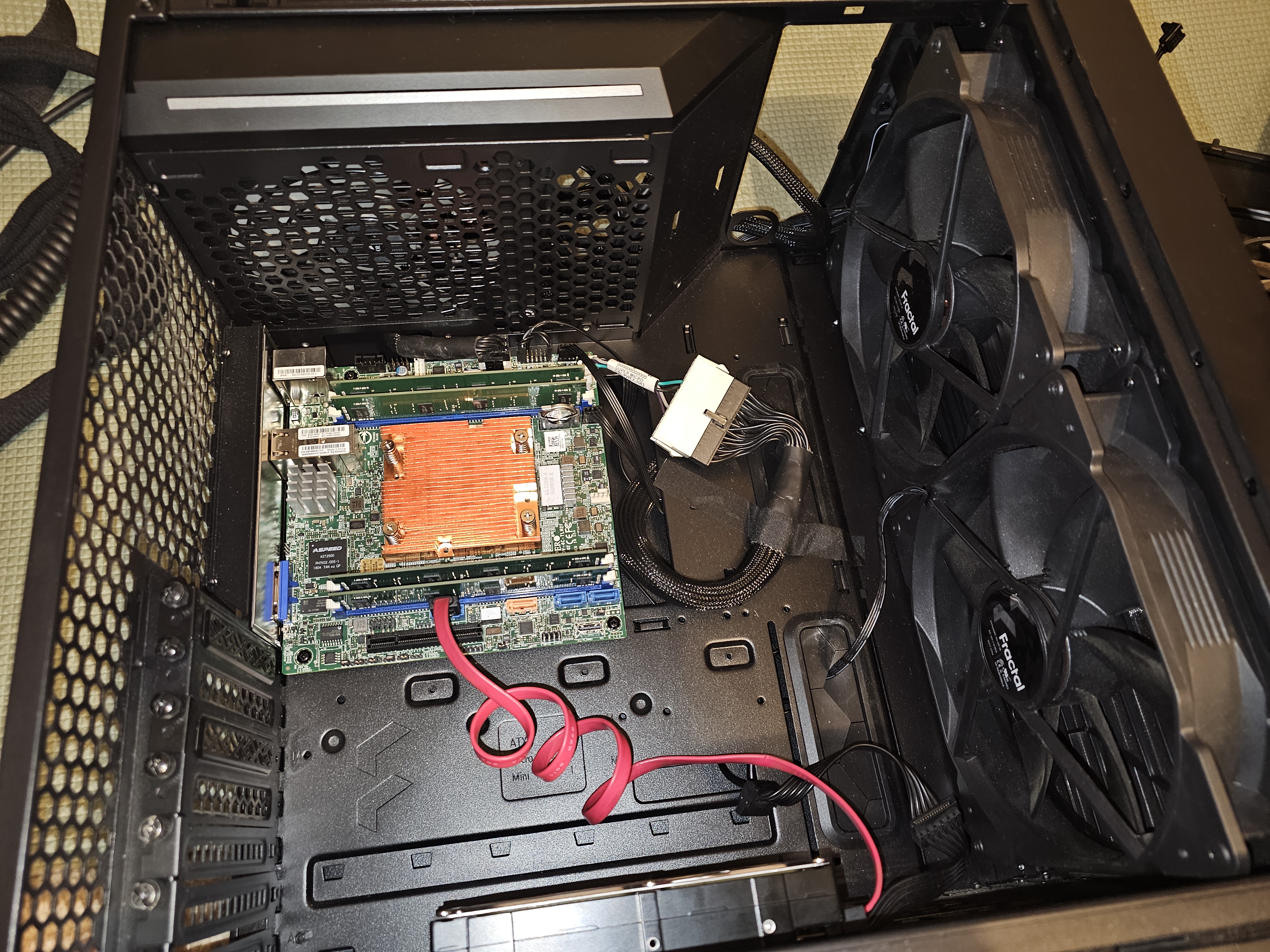 Материнская плата: Supermicro X11SDV-4C-TLN2F опция Out Оf Band Management активирована Процессор: Intel Xeon D2123 (Skylake 4C/8T, TDP 60W) Оперативка: 4x 8GB Kingston Registered ECC DDR4-2400 Жесткий диск: Seagate Exos 7e10 8TB БП: Corsair RM550x Корпус: FD Torrent Compact Solid Black c двумя комплектными 180мм вентиляторами (сохранился конверсионный кит на 3 вентилятора 120мм).