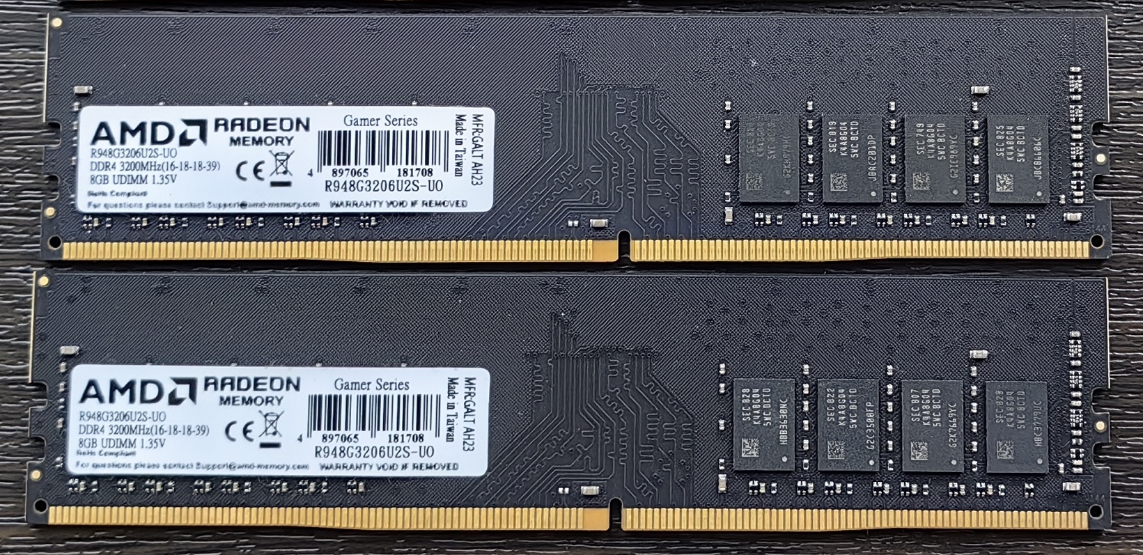 2. AMD DDR4 8Gb 3200MHz pc-25600 (R948G3206U2S-UO), 16-18-18-39 1.35 v. На гарантии до конца 2032 года 3Logic Group (Новый Ай Ти Проект). 2 модуля. Продаются парно, цена двух модулей - 5600 рублей.