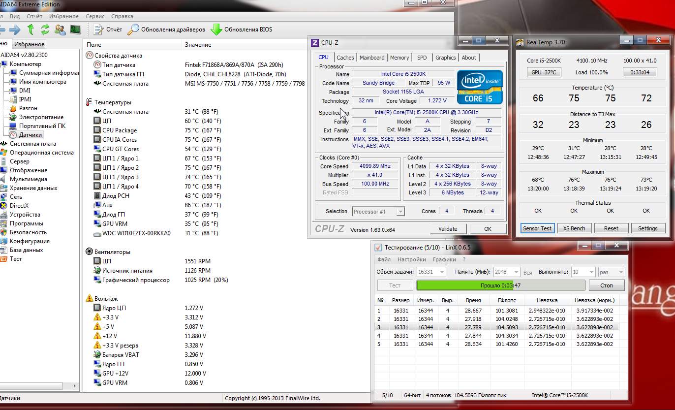 Сделал настройки турбо разгона согласно профилю, ссылку на который дал Вадим++. Частоту памяти поставил 1866Мгц. Поиграл минут 20в БФ4 вроде норм (единственное забыл включить риал темп во время игр, что бы посмотреть какая макс температура была). Разгон в турбо режиме до 4,1 Ггц вроде как и не большой, но все же решил прогнать тест на стабильность в Linx. Тест прошел без ошибок (да там собственно 10 прогонов всего, но все равно), но есть НО: 1. во время теста раза 3 может четыре раздавались звуковые сигналы (возможно порог температуры был превышен) или...? 2. посмотрел статью по разгону моего проца на овере. Там при 4Ггц температура самого горячего ядра 49 С, а у меня 77С при 4,1Ггц!!! К тому же температура постоянно прыгала где то от58 до 77 С. В Linx гфлопс какой то высокий. Я в целом не знаю что эти зеачения означают. Поэтому кто реально разбирается что к чему помоготи и мне понять где собака порылась. Ща пост запощу скину все в дефолт и прогоню Линксом. Заранее всем спасибо.