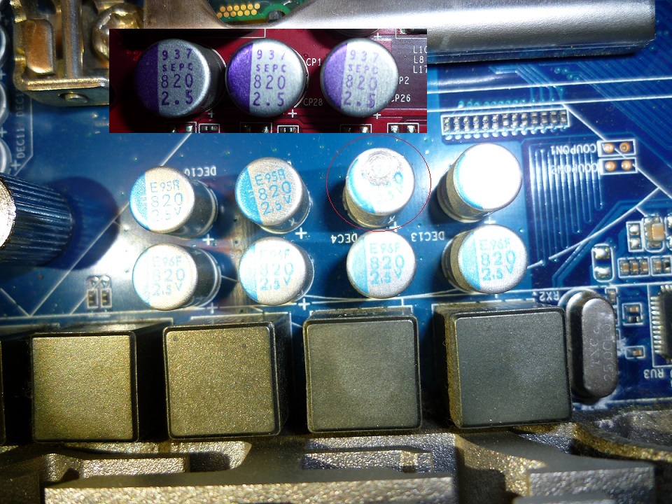Добавлено спустя 2 часа 27 минут 53 секунды: Любопытство взяло верх над ленью и я все таки припаял кондер 1000мкф к старой видеокарте и она даже заработала. Бп перестал пищать, но разгон так и не получился. При превышении частоты в 2.8ггц комп жужжит, но на экране нет сигнала. Неужели все проблемы из за конденсатора? Поставил же такой же рабочий, неужели плохо припаял? Как вариант, отнести в какой нибудь сервис к специалистам, что бы они перепаяли деталь, но разве комп бы работал стабильно, если бы была проблема на месте конденсатора? Ниже фото, там отмечен поврежденный кондер и рядом вставил в паинте кусочек от фото кондеров с видеокарты, один из которых я поставил на место поврежденного. Конечный результат не зафиксировал, но выглядит все аккуратно. Сомневаюсь, что плохо припаял, но если не останется вариантов, пойду в какую нибудь мастерскую, новый кондер припаивать, на старой видюхе еще три таких есть