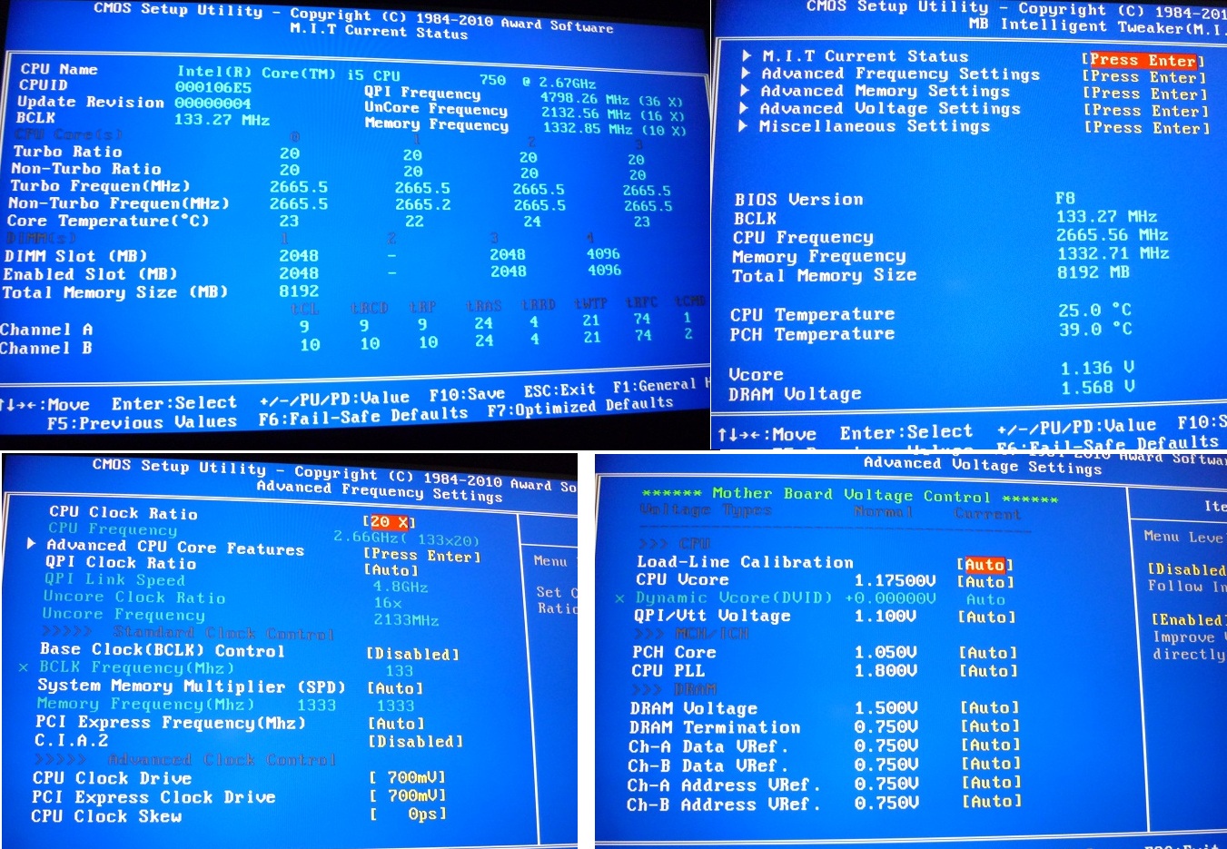 Ecowar В последнюю неделю пытался поиграть в гта и игрался с настройками частоты. Максимум, вырубался комп от перегрева проца при бенчмарке. Принудительно напряжение не поднимал, оно само выставлялось нужное всегда. Сейчас поставил Vtt Voltage 1.410 и CPU VCore 1.375, комп не заработал, как и следовало ожидать, максимальная частота 140mhz, если выше то колом. Скинул биос в двадцатый раз и сделал фотографии биоса в дефолте. Потом загрузился, включил единственный рабочий режим Faster, при перезагрузке частота выставилась до 140mhz, соответственно 2.8ггц, напряжение при этом осталось то же. Все эти манипуляции и показания тоже сфотографировал. Может по циферкам станет понятно, где поковырять еще?
