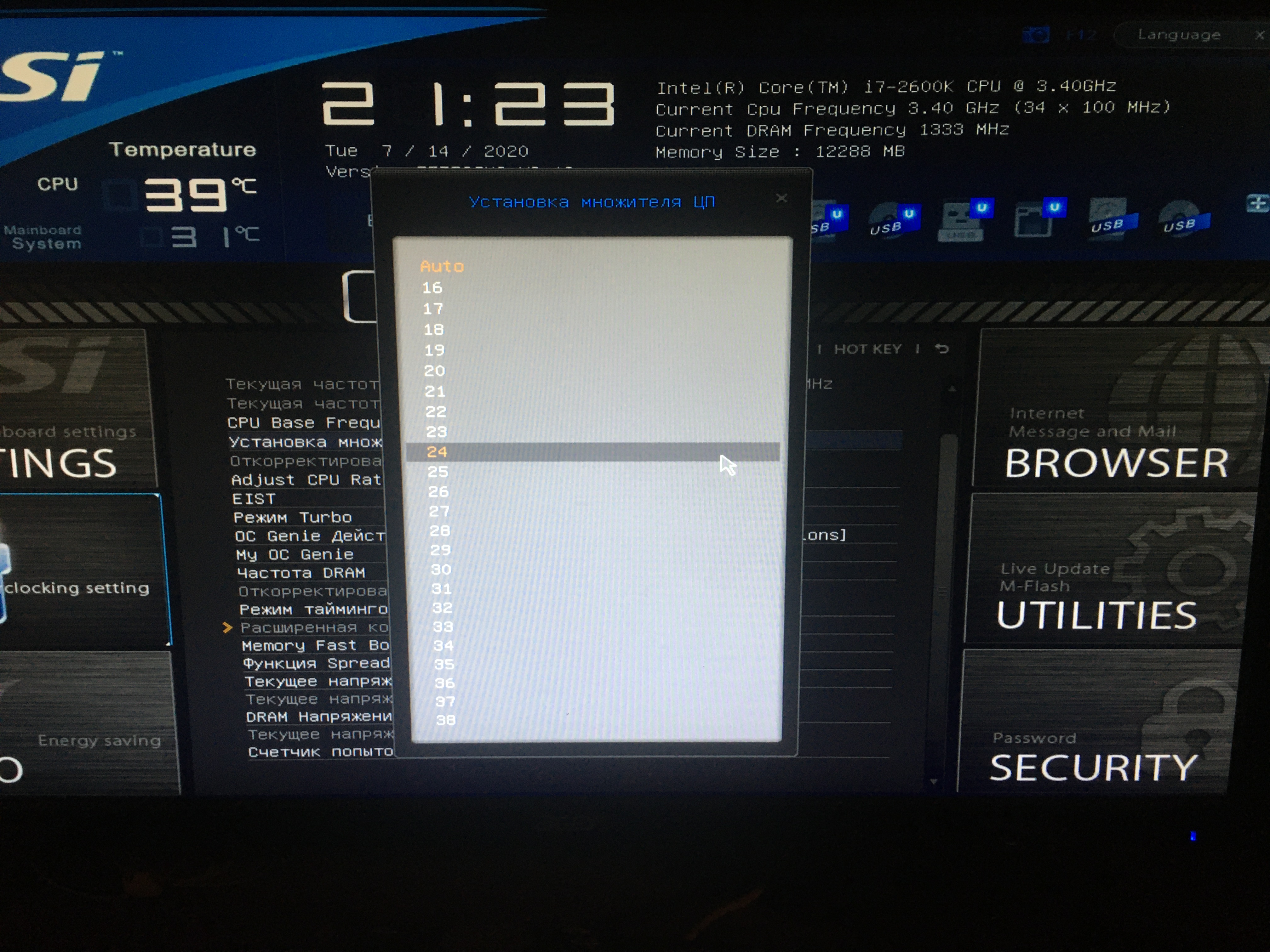 Начни с начала: 0. Почитай руководство к плате на предмет, нет ли на ней каких-то кнопок-блокираторов множителя или чего-то в этом роде. 1. Скачай последний BIOS (2.13) - https://ru.msi.com/Motherboard/support/Z77AG41. 2. Выключи компьютер, вынь батарейку на минуту, чтобы BIOS сбросился полностью - проверить можно по тому, что системное время сбросится. 3. Попытайся поменять множитель (в том числе и с клавиатуры). 4. Если не получается поменять множитель, прошей новый BIOS. 5. Повтори пункт №2. 6. Повтори пункт №3. 7. Пошарься на этом форуме https://forum-ru.msi.com/index.php?board=2.0.