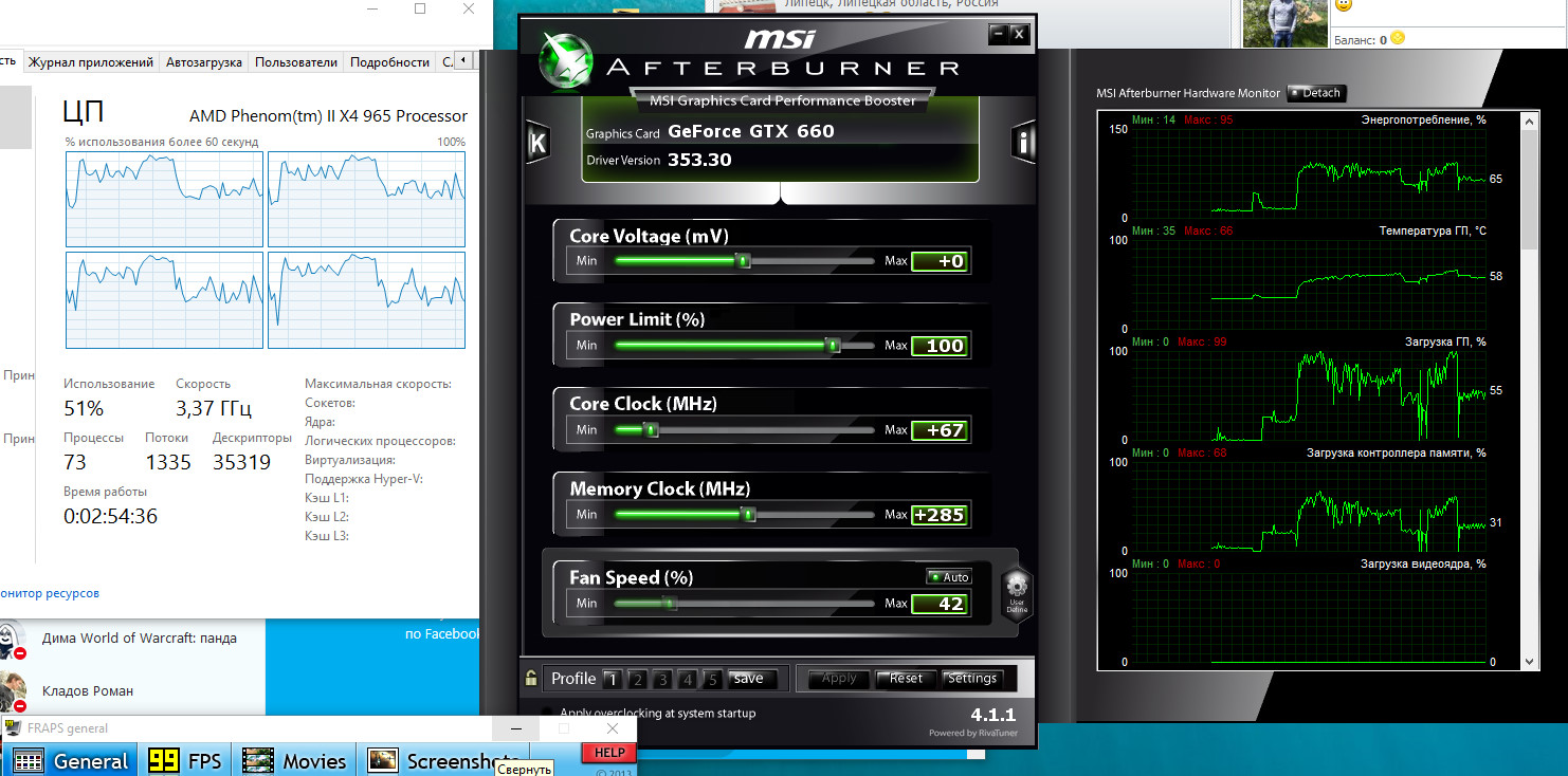 понятно подскажи вот ещё что! Gigabyte GV-N660WF2-2GD (rev. 2.0) практически нет прироста fps +1-2 при разгоне! разгонял через MSI Afterburner может что не так делаю? выше ставишь чем память на 289 ядро на 54 просто комп вырубаться начинает, а температура нормальная 63-65 максимум! пробывал на игре ведьмак 3 и Crysis 3 так и в бенчмарках фулмарке и MSI Kombustor 3 проц Phenom II X4 Black Edition 965, разогнан сток 3400 мг разгон 3800мг больше не гониться ! это сток вот стоковые частоты! что 2-3фпс это максимум что можно выжать из видюхи? Версия DirectX: 12.0 Графический процессор: GeForce GTX 660 Версия драйвера: 353.30 Версия API Direct3D: 12 Уровень возможностей Direct3D: 11_0 Ядра CUDA: 960 Тактовая частота ядра: 980 МГц Скорость передачи данных памяти: 6578 МГц Интерфейс памяти: 192 бит Пропускная способность памяти: 157.87 ГБ/с Доступная графическая память: 6143 МБ Выделенная видеопамять: 2048 МБ GDDR5 Системная видеопамять: 0 МБ Разделяемая системная память: 4095 МБ Версия BIOS видео: 80.06.58.00.97 IRQ: Not used Шина: PCI Express x16 Gen2 Идентификатор устройства: 10DE 11C0 36251458 Номер комплекта: 2030 0000