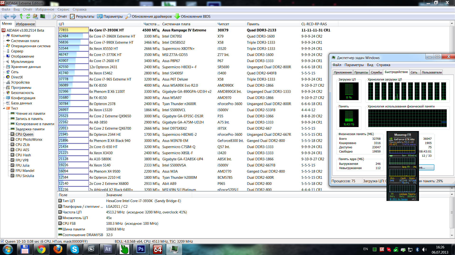 Системная плата: Тип ЦП HexaCore Intel Core i7-3930K, 4500 MHz (45 x 100) Системная плата Asus Rampage IV Extreme (1 PCI-E x1, 5 PCI-E x16, 8 DDR3 DIMM, Audio, Gigabit LAN) Чипсет системной платы Intel Patsburg X79, Intel Sandy Bridge-E Системная память 32708 МБ (DDR3-1333 DDR3 SDRAM) DIMM-A1: Team Group Vulcan-2133 8 ГБ DDR3-1333 DDR3 SDRAM DIMM-B1: Team Group Vulcan-2133 8 ГБ DDR3-1333 DDR3 SDRAM DIMM-C1: Team Group Vulcan-2133 8 ГБ DDR3-1333 DDR3 SDRAM DIMM-D1: Team Group Vulcan-2133 8 ГБ DDR3-1333 DDR3 SDRAM Тип BIOS AMI (03/15/2013)
