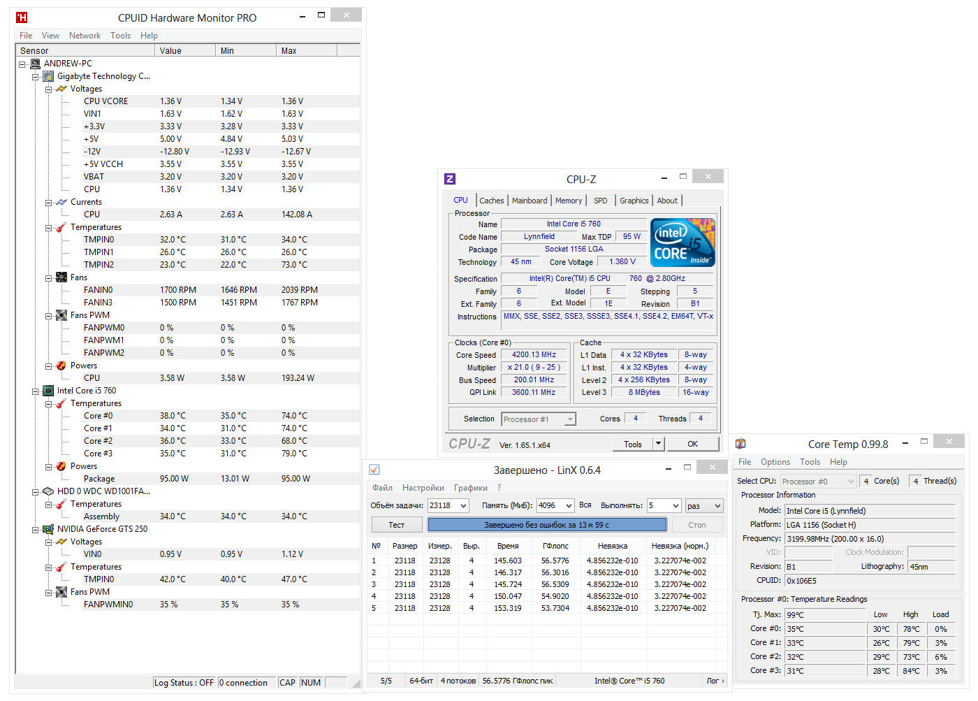 kast Сынок, вы видно сами плохо считаете, у \no.69 УЖЕ 84 град. по самому горячему ядру. Итого даже по вашим рассуждения 84-10=74 град., предел рабочей температуры CPU. Не говоря уже о том, что эта температура ни летом и при 2000rpm на кулере. Запустите тест FPU с том же AIDA и увидите температуру еще больше, чем в линпаке. Это так, в рамках информации. Тот же BF4 нагреет CPU до 75-76 град. в тех же условиях