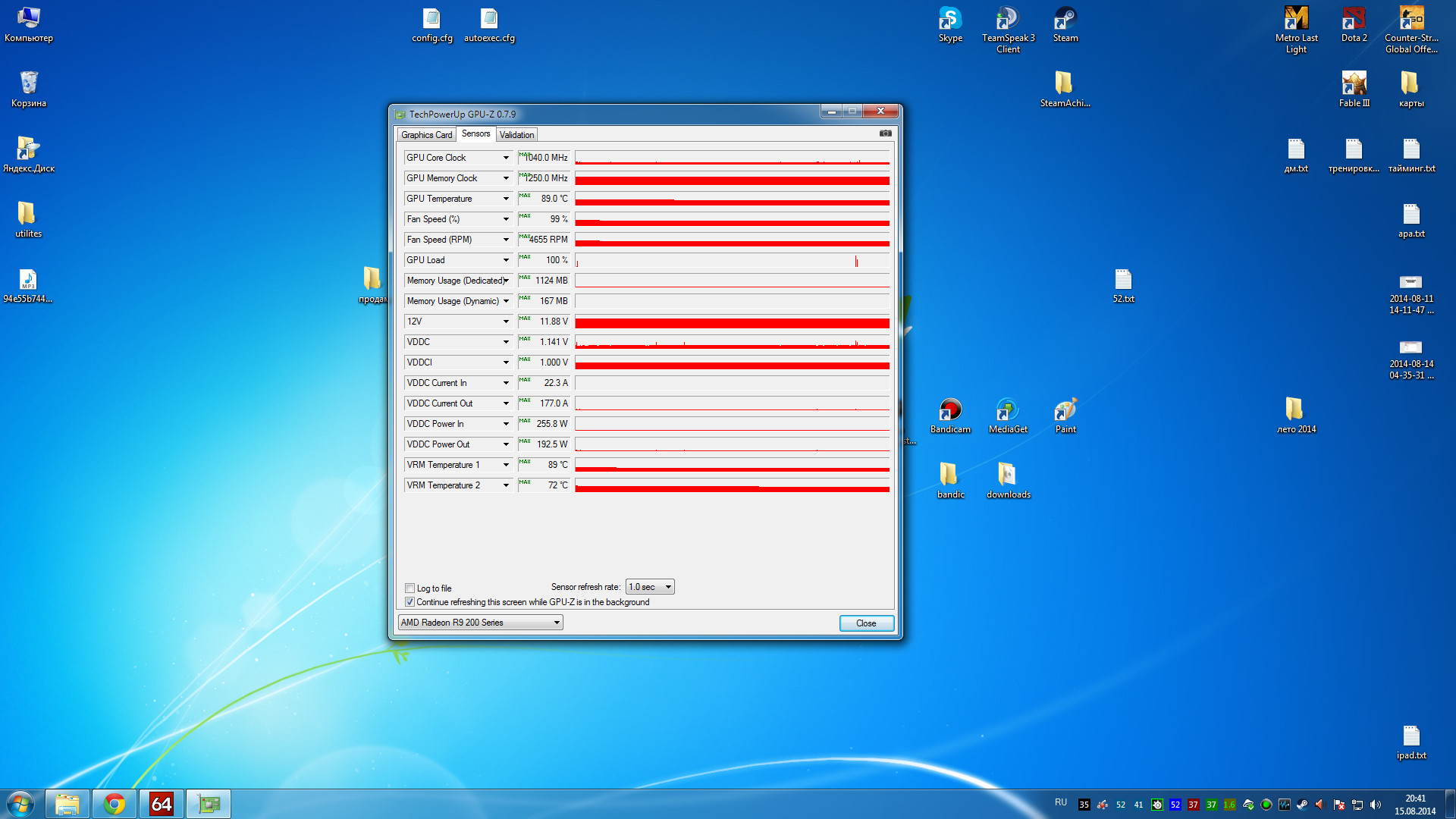 Всем привет. Играя в метро:лл на максимальных настройках очень сильно ужаснулся, когда увидел температуру видеокарты ... Собственно ВК стоит вот эта - http://technopoint.ru/catalog/i6635985/videokarta-pci-e-gigabyte-amd-radeon-r9-290-4096mb-512bit-gddr5-dvi-hd До этого никогда не было ВК от ати, брал из-за цены, поскольку многие говорили, что она =780, а цена дешевле на 1/4. Вообщем вот скрины с температурами, показанные утилитой AIDA64 Extreme (см. в конце) (1 синий квадрат - видеокарта, красный - процессор, зеленый - мат. плата) . Еще насторожило, что компьютер выключился произвольно, то ли перезагрузился... возможно из-за высокой температуры. А 2) может стоит разогнать данную ВК? Вот вся хар-ка ПК: Память - ddr3, 8 ГБ, 1.6 Мгц Мат. плата - Gigabyte H77-DS3H процессор - intel core i5-3550 3.3 Ghz (tb 3.8) Жесткий диск - 1tb Seagate 7200 Barracuda Cache 64MB БП - OCZ StealthXStream ll 600W Кулер - DEEPCOOL Ice Edge Mini FS