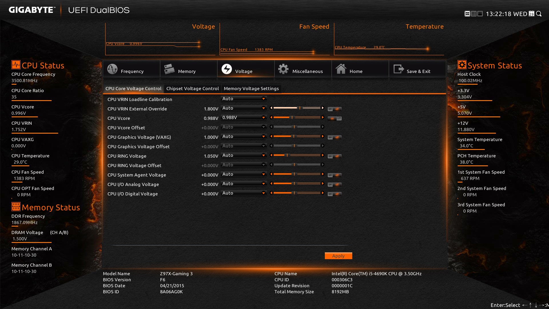 Привет ребята Есть конфигурация - core i5 4690k , gigabyte gaming 3 ,fury 2x4 gb , corsair cx600m , performa cnps10x, 970 g1 gaming Проблема состоит в том , что на стоковых частотах с турбобустом 3,5-3,9 работает все отлично , но только я хочу разогнать меняю множитель на 4,5 и вольтаж и после перезапуска мне выдает ошибку запуска , но без видеокарты все включается и разгоняется . Вот не знаю на что думать .помогите! PS фото внизу.