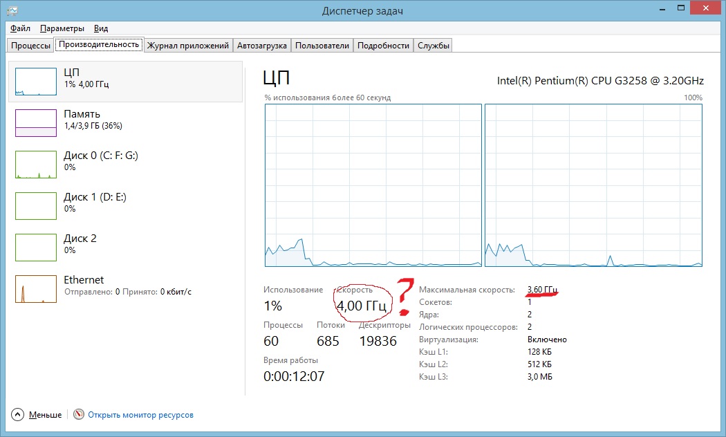 Так сами же понимаете что хочеться уже рагонать его - руки чешуться - а потом уже разобраться детальнее. Посмотрел и там всё про i5 i7 и только результаты ( и гонят на Z чипсетах а у меня H) - а что имменно менять и как у меня может быть такое низкое Vcore если в настройках оно начинается с 0.8 и везде написано что оптимально 2.5 - 3.0 для существенного разгона. Из той кучи статей что я прочитал про разгон этого проца (в том числе на overclockers.ru) и видео что посмотрел на youtube (везде всё по разному). Я понял что нужно делать так - Выставляю CPU Ratio, Фиксирую Ring Ratio (это только в нескальких написано), CPU Core Voltage Mode - ставлю override, CPU Core Voltage - ставлю не больше 2.5 - 3.0. Я правильно понял (или это великая тайна как его разогнать?). Всё равно остаются не понятно почему Core Voltage стоит 0.144V (поэтому боюсь его вручную трогать). И что означают эти 4Ггц в диспетчере задач при разгоне до 3.6 Ггц? И везде противоречивая информация - в одном ролике говориться что нужно обязательно CPU Ratio Mode поставить в Fixed, я так попробовал сделать и получается что в aida и cpu-z разгон написано что есть, в винде - что его нет, и по тестем получается результат как у 3.2 Ghz. Может кто-то помочь с разгоном?