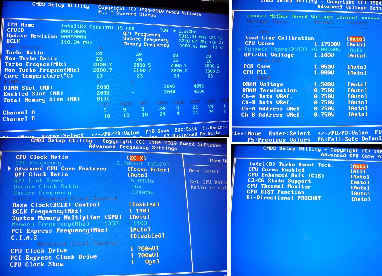 Ecowar В последнюю неделю пытался поиграть в гта и игрался с настройками частоты. Максимум, вырубался комп от перегрева проца при бенчмарке. Принудительно напряжение не поднимал, оно само выставлялось нужное всегда. Сейчас поставил Vtt Voltage 1.410 и CPU VCore 1.375, комп не заработал, как и следовало ожидать, максимальная частота 140mhz, если выше то колом. Скинул биос в двадцатый раз и сделал фотографии биоса в дефолте. Потом загрузился, включил единственный рабочий режим Faster, при перезагрузке частота выставилась до 140mhz, соответственно 2.8ггц, напряжение при этом осталось то же. Все эти манипуляции и показания тоже сфотографировал. Может по циферкам станет понятно, где поковырять еще?