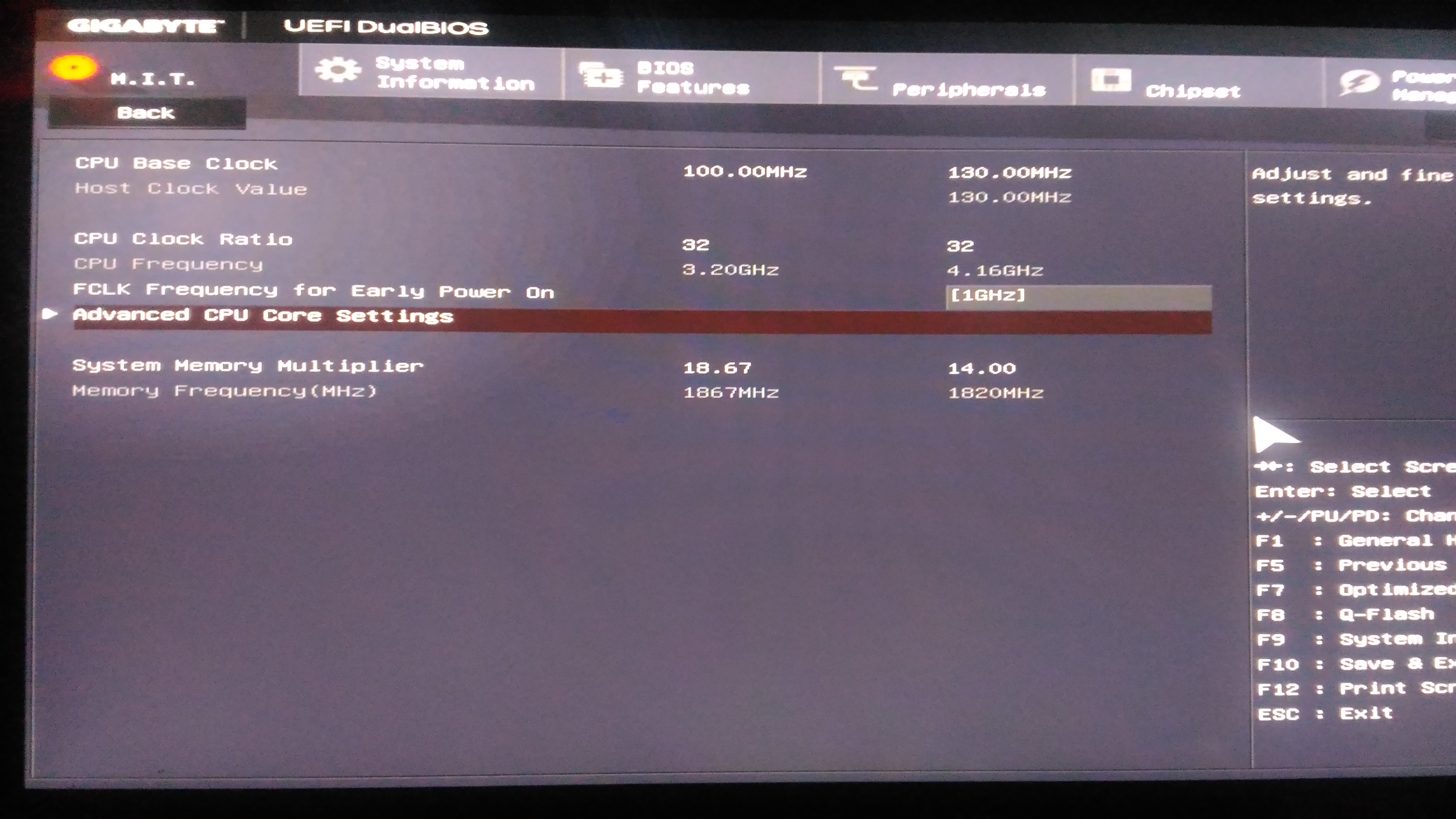 Я может опять не по адресу. ga-z170-hd3 ddr3 Мать оператива ддр 3 1860 (х2 4 гб) хайперХ I5 6500 рх 480 (8гб) Вообщем поставил модифицированный биос, перепробовал все но так и нечего и не добился. В 90 % случаев не стартует (пишет ошибка запуска) Запустилось типо с разгоном 3 раза но в биосе 4200мг По факту цпу з доп нагрузкой показывает 3600 Внизу настройки с которыми пару раз запустить удалось систему. Если кто может подскажите, я первый раз пытаюсь разогнать, пользовался кучей видео по разгону.