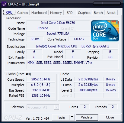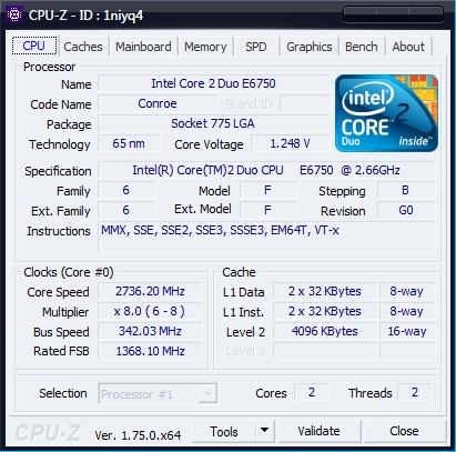 Сразу к главной проблеме: проц. Во-первых его слишком малый вольтаж по сравнению с оригинальной статьёй про разгон e6750. Во-вторых - наглый отказ матери влиять на вольтаж. Хоть авто ставь, хоть 1.54 (что является пределом в биосе) - один фиг max будет 1.264v, в простое 1.032v (и дабы предопределить возможный вопрос - да, настройки биоса не сбрасываются, всё остаётся как поставишь). Ещё страннее - при стресс-бенче cpu-z вольтаж опускается до 1.248v [Скрины 1, 2 и 3 соответственно] Но даже без изменения вольтажа поднять fsb больше чем на 9mhz (+9! ) не выходит - дальше только цикличный ребут.