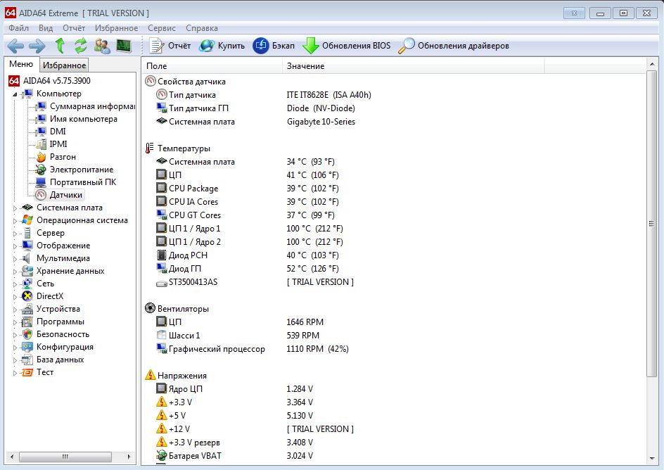 после запуска пк убедился через CPU-Z что все в порядке после врубил MSI afterburner + riva turner, зашел в игру(думаю не важно в какую) и сразу увидел на рива тернере значение температуры в 100 С, офигел вообще с такими глазами сидел О_О, после скачал аиду 64, и вы можете увидеть на скриншоте что температура ЦП нормальная, а температура ЦП1 и ЦП2 в простое 100 С и никак не колеблится ничего это что такое ? и как это пофиксить может кто знает ?