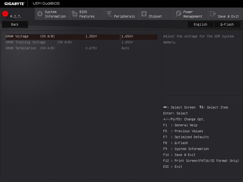 Имею в наличии 4 модуля памяти Kingston KHX1600C9AD3B1K2 по 2 GB. На старой матери (ASUS M5A97) эти модули работали на частоте 1600 с повышением напряжения до 1.65 (как советует производитель), но на новой матери (Gigabyte GA-B150M-DH3) в биосе наличиствует огромное количество настроек напряжений, в которых я разобраться не могу, а при установке значений по наитию напряжение похоже не повышается и модуль на заявленной производителем частоте не стартует. Как надо подкрутить настройки, чтобы поднять частоту на этой плате?