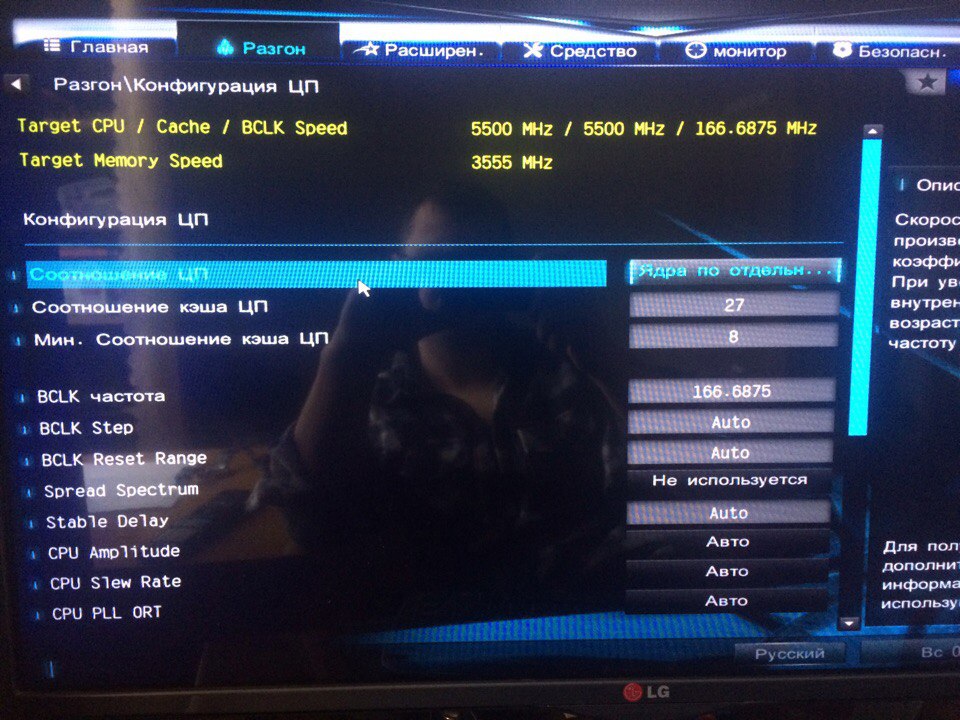 Inidl, вот так гнал инженерник QH8G. Разница только в напряжении памяти. https://forums.overclockers.ru/gallery/image.php?album_id=2971&image_id=23129 System Agent Voltage (VCCSA) можно поставить поменьше - 1.15 или 1.20v, VCCIO - 1.10-1.15v, на память по SPD -1.2v или 1.35v (смотря что за память), LLC - не 4 уровень, а первый или второй, Boot Performance Mode - None MAX Turbo Performance. И начать не с 4500, а с 4000 МГц на выбранном напряжении на процессоре. - BCLK Step - Disable, FCLK - Auto или 400, Соотношения ЦП - "ядра по отдельности" сменить на что-то более регулируемое и выставить там множитель максимальный (27), а кэш наоборот снизить хотя бы до 25 и мин кэш тоже 25, чтобы не прыгал. BCLK поменьше, вдруг проц просто не может взять эту частоту с таким напряжением. - На одном скрине турбобуст включен, на другом выключен. Нужно выключить везде, или снизить BCLK - проц не сможет работать на 5500 МГц. - Память выставлена 3555 МГц, что невозможно при такой напруге. Может сбрасывает из-за этого. Вместо XMP можно выставить Мануал и вручную проставить основные тайминги и стоковую частоту (желательно поближе к основному делителю без включения дополнительных делителей). - За двойной старт отвечает CPU SVID Support (на Асроке может называться по-другому). - Судя по всему проблема в множителе процессора. Он нигде не выставлен, поэтому сбрасывается в минималку. Нужно выставить множитель вручную. Там выставлен не множитель проца, а множитель кэша проца.