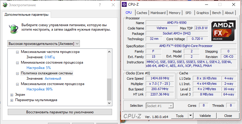 Провел настройку C'n'Q на материнской плате Sbertooth 990 R2.0, занизил частоты процессора до 4000 и вольтаж до 1.340 и выставил в ОС максимальное состояние процессора 99% а минимальное 55%, но что-то я не понимаю в чем прикол. Меняя в меню Максимальное состояние процессора на 99% очень резко сбрасываются частоты и напряжение до 1400MHZ и 0.700V. Вот не могу взять в толк почему так и как это поправить? В настройках стоит максимальная частота 0 по дефолту, но даже если выставить значение к примеру 4500MHz роли это не играет почему то... просматривал статистику с помощью HWmonitor PRO даже при стресс тесте процессора частоты не поднимаются выше 1414MHz а напряжение не выше 0.72V и как я не старался загрузить процессор у меня так и не получилось увидеть реакцию системы и повышение частот, в итоге система просто начала тормозить при нагрузке через OCCT. Делал прогон через 3Dmark кроме падения производительности к сожалению я ничего не увидел. Складывается такое впечатление что в системе какой-то глюк не дающий адекватно использовать частоты. Подскажите как правильно настроить систему энергопотребления и сделать настройку частот так чтобы в простое они были 1.700MHZ и при нагрузке возрастали?