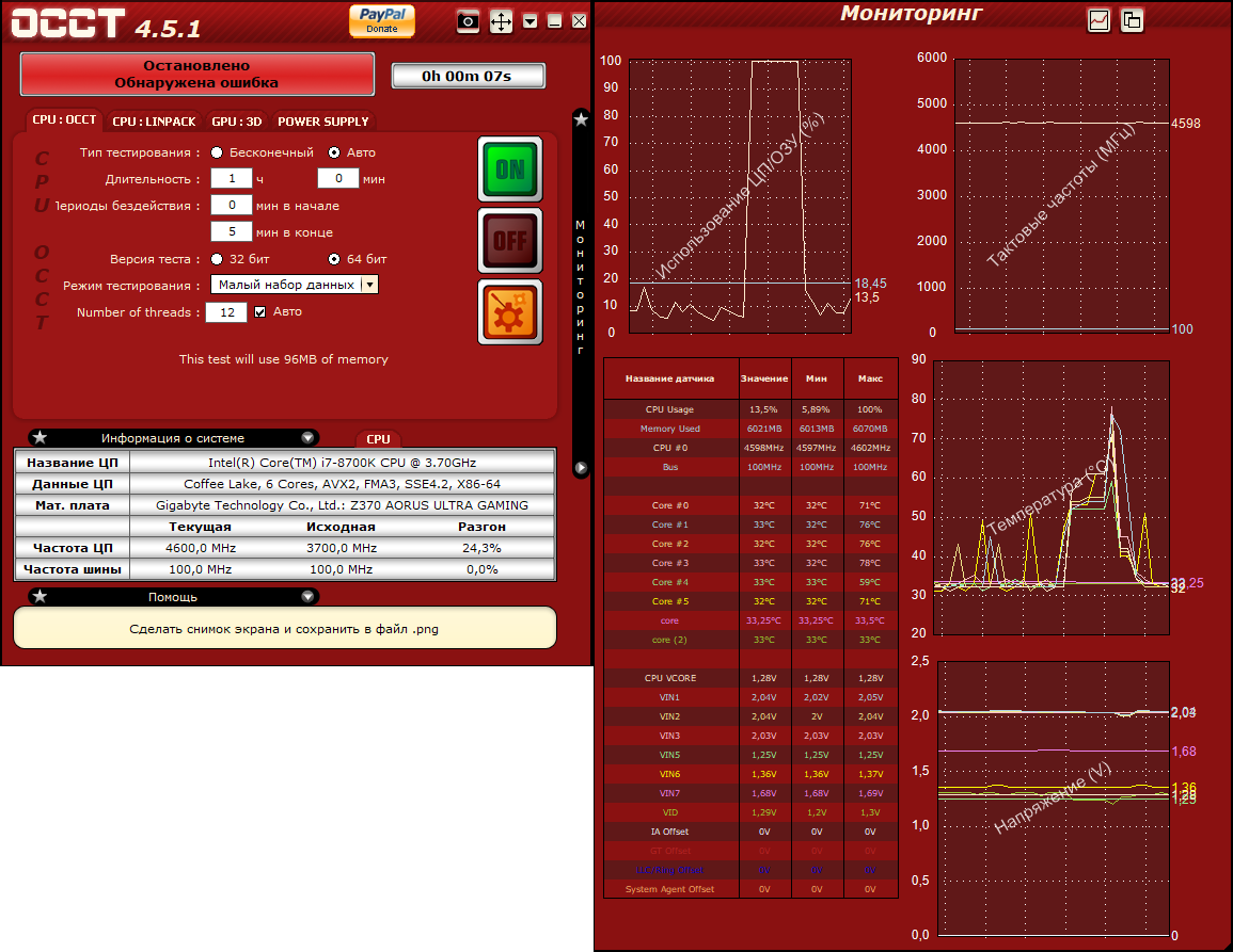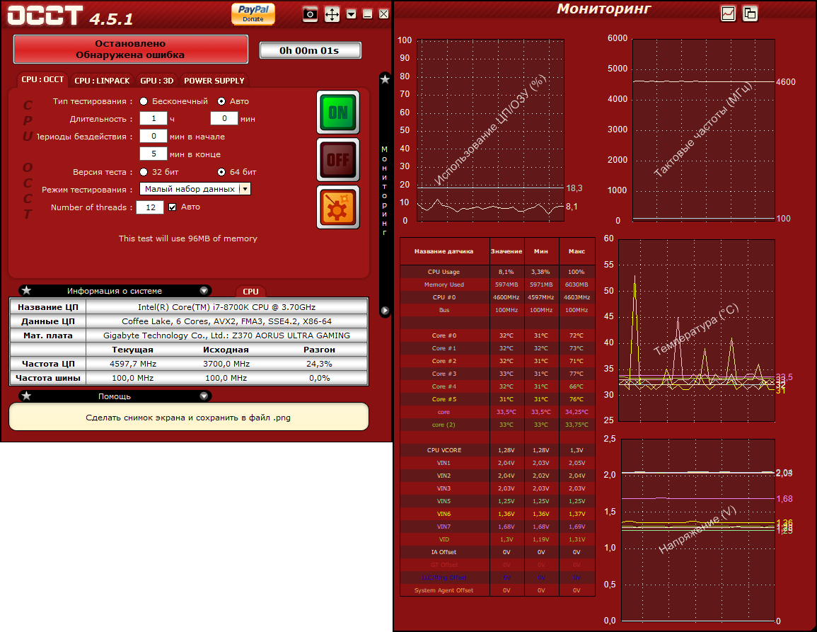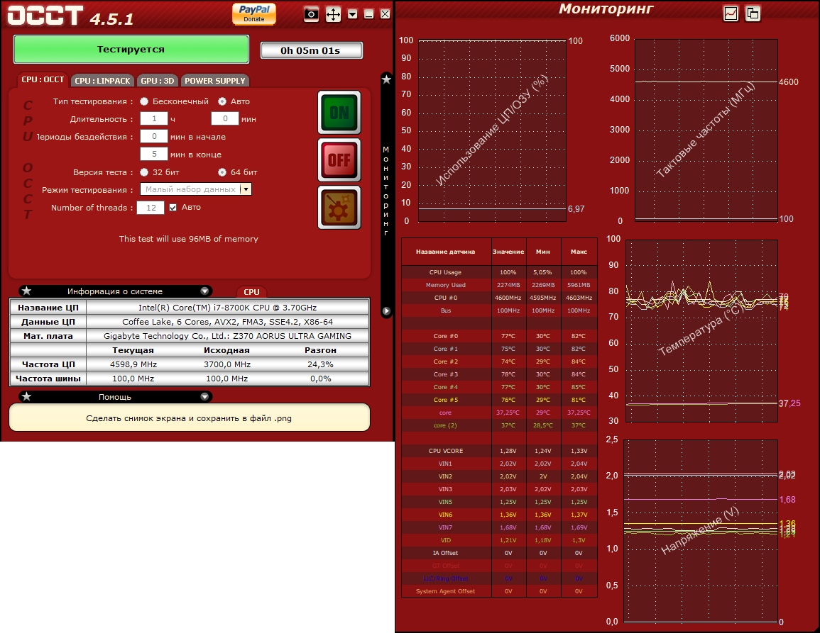 Доброго времени суток. Была проблема на i7 4770k с материнской платой z97-hd3 gigabyte, когда при выставлении cpu vcore например на 1.3v, в программе occt при тесте этот параметр скачет от 1.28-1.34v. Сначала думал, что косяк программы, поэтому обновил ее и заодно протестировал в аиде - проблема та же (т.е. в аиде показывает те же скачки напряжения). Обновил бп - ситуация та же. Сейчас обновил проц и мамку на i7 8700k и aorus ultra gaming 2.0 - проблема та же самая. Выставляю напряжение (при разгоне 4600ghz) 1.28v, а оно скачет 1.26-1.34v, ну т.е. все так же. Разгон при этом сделан по настройкам с зарубежных оверов, т.е. каждый параметр в биосе выставлял так же, как и у других людей, чтобы не намудрить нигде и не включить какую-нибудь функцию энергосбережения. Сейчас грешу на электричество из-за плохой проводки, возможно, но сам в этом полный 0 и как проверить/подтвердить данную теорию не знаю. Подскажите, пожалуйста, как быть.