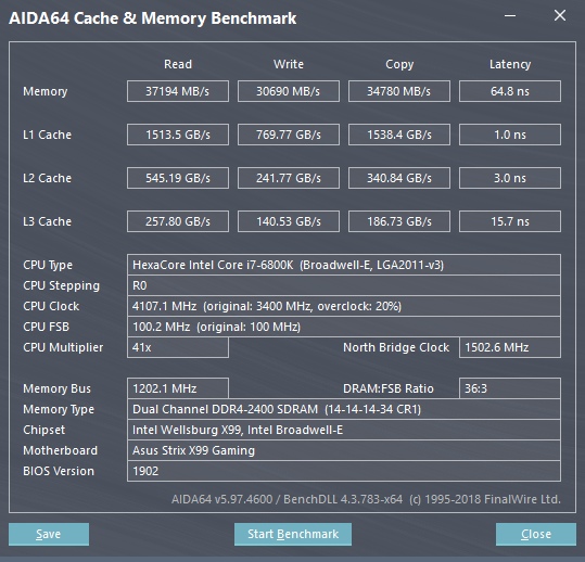 Конфигурация следующая: Мать ASUS ROG STRIX X99 Проц i7-6800K (4,1 ГГц, 1,27 В) Оперативка - двухканал из двух плашек Corsair LPX по 16 Гб (32 Гб, 1,2 В, 2400 МГц, 14-14-14-34)