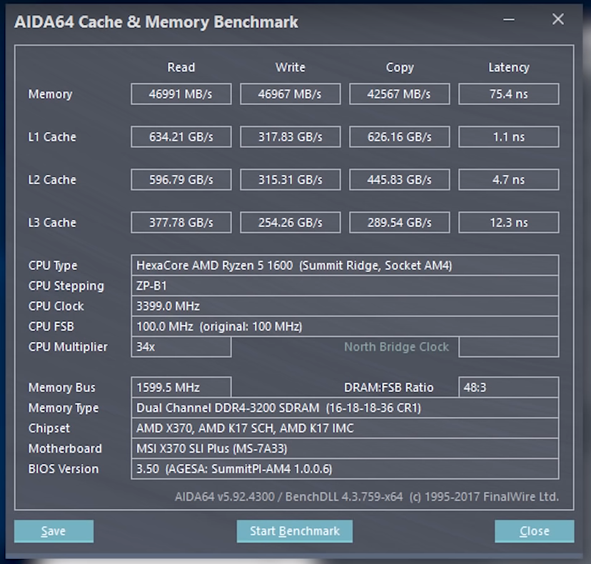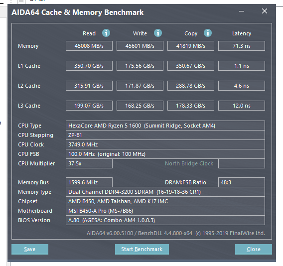 Разогнал процессор до 3,75 Мгц с вольтажом 1.2375 Память до 3200 на таймингах 16-19-18-18-36. Все было нормально. Как-то решил я провести тест памяти и кеша в аида 64... Удивился, что показатели L1, L2, L3 кэшей очень низкие и отличаются от заявленных. Прилагаю скриншоты со скоростями кэша. На первом - как должны быть, на втором - мои. Помогите решить проблему, пожалуйста. Обновление биоса не помогло мне. Вольтаж поднимал тоже. Скидывал настройки биоса в дефолт. Скорость такая же.