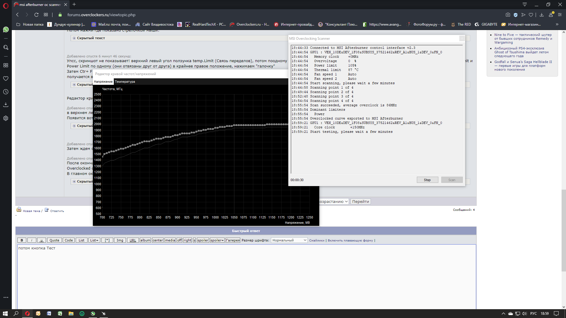 Сейчас попробовал воспользоваться авторазгоном своей 1070. Выставил Core Voltage, Power Limit и Temp. Limit на максимум, запустил OC Scanner, нажал кнопку test, после теста нажал scan написало следующее: